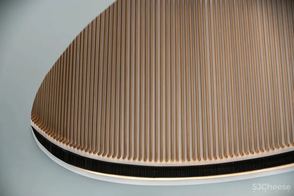 31设计,从建筑景观室内整体化全方位考虑设计,取意长江流动韵意,呼应建筑流动线型设计,将观景、漫步的体验延续至室内,纳入室外花园的四季变幻及自然元素,达成情景共融。以强烈的流线造型渲染现代自然优雅的空间氛围,把流动艺术之美发挥到极致,弱化室内外的界限,带来无边界的有机整体感。空间光与影、虚与实、材质的对比与精致细节的打磨,让人在与空间共处中产生共鸣。