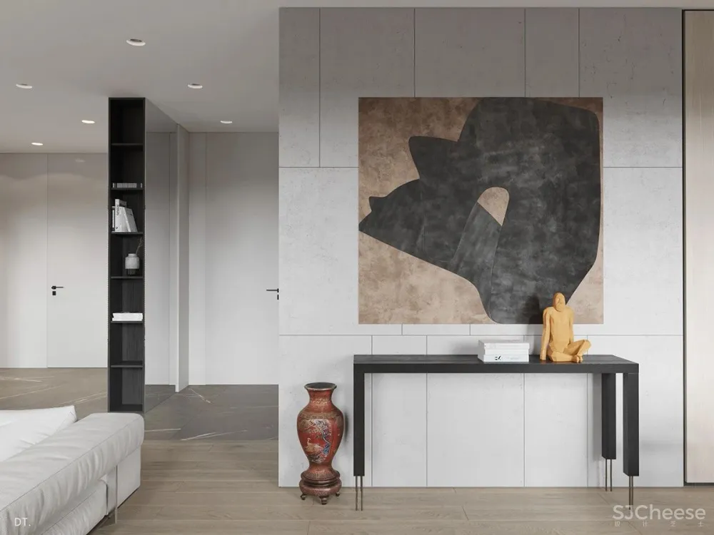 雕花花瓶、简约边柜、侘寂画作、神态端详的泥雕,四者点到即止的距离摆设熏陶出高雅的艺术气氛。