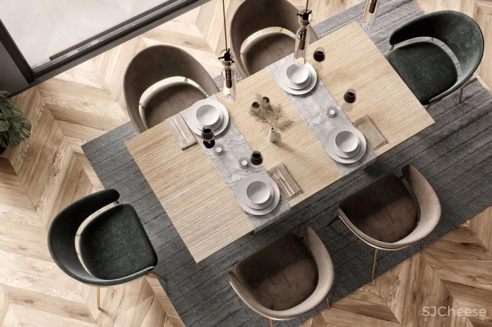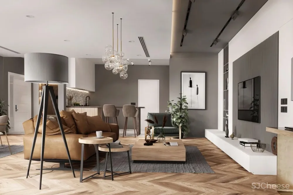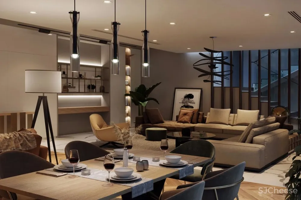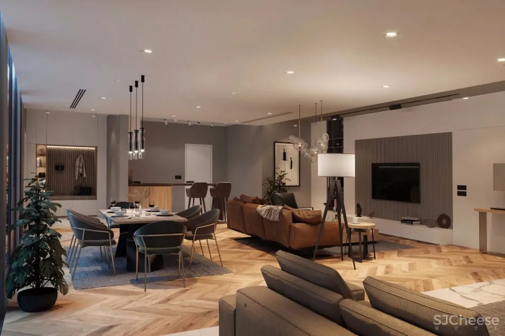 The lighting technology adds enough light to the room, while the downlights flash on the ceiling like stars, and there are lights in the storage compartment. The gray tone and white color of the wall complement each other, and the floor adopts the earth color system to form a W shape. Log table and sofa with the same color cream color, downlight irradiation on the table, to create an atmosphere for dining.