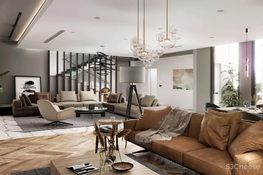 Gray consistent mainstream color system and the composition of the earth color space, not only does not appear very stuffy, but also shows a high-level sense. Warm yellow leather sofa, with log tea table table table, inserted in a transparent glass bottle of some natural green plants. The transparent glass ball lamp above the ceiling is pulled by thin metal wires. The staircase is separated by fence, which is also used as the background of another living room. The beige sofa is equipped with round marble table, and the black rotary lamp art is full of modern feeling.