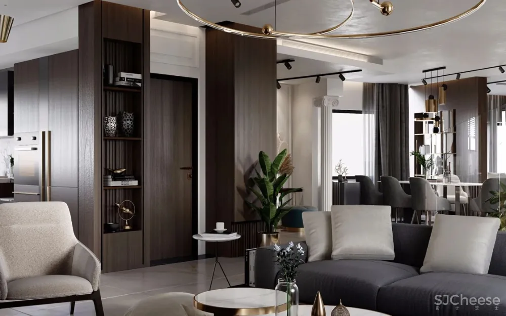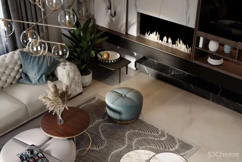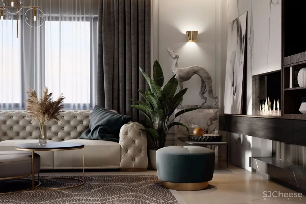The brown Pendant in the living room glitters in the light. The marble wall is made of rose gold to create a sense of vertical extension of the line. The lamp decoration in the shape of sea urchin on the ceiling adds a sense of art to the space. Even the black-and-white gray shape of the floor also gives people a sense of difference. The 360 ° rotatable light luxury screen with black and white patterns is full of story sense. The bottom and details of fashionable tufted sofa are painted with gold, which makes a sense of luxury.