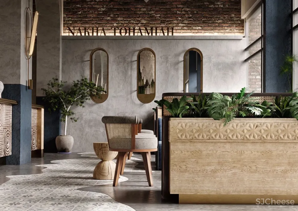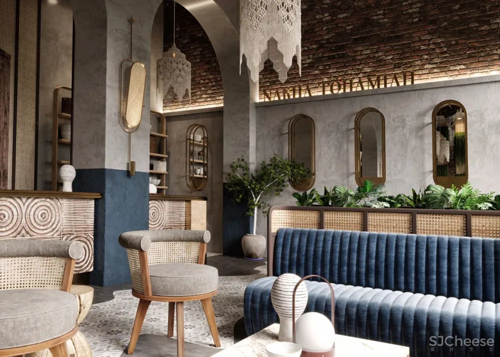 楼梯上方的墙面种植绿植,自然垂落下来,形成一道独特的风景线。两个带花纹的厚实白色靠椅,以绿植花圃为背景展开。大的立柱下方为蓝色上方为灰色,形成多个拱门状,呈现建筑的宏伟。而吧台也颇具特尔,木质年轮状花纹与条纹相配,放置碗柜的置物架在灰色背景下,有种回归原始的古朴感。