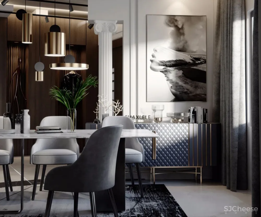 餐厅运用白灰色,搭配金属质感吊灯,柜子采用雾霾蓝加时尚的衍缝纹理,灰蓝色地毯把大理石桌面映衬出整体的质感。一个透明的圆柱形玻璃花瓶,插上绿叶点缀桌面,沙发椅用白色配深蓝色,靠椅流线型幅度,展现出优雅的格调。