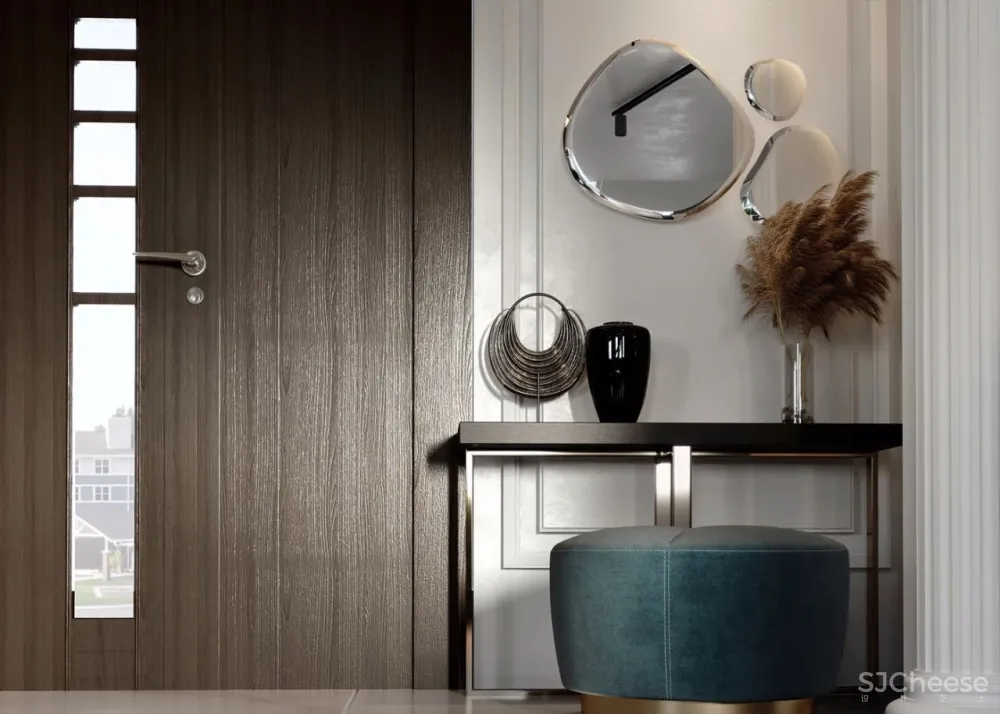 The dining table chooses the log color to match the gray floor, and the seat uses the tea color and the dark green, the chair foot uses the gold. Cabinetry chooses log color, collocation terrazzo sticks metope, and coffee color bar cabinet matches grey bench. The center of a white cabinet is made of log color fence, and clothes are hung in the middle area, and a row of separate lockers can be used to place books or match with ornaments, reflecting the aesthetic art of the host.