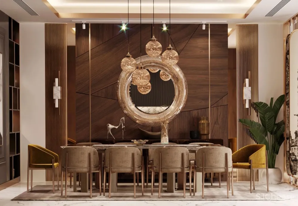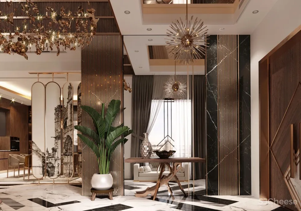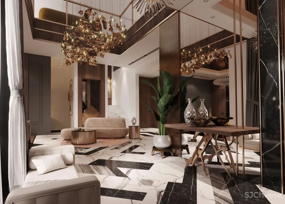 客厅茶色的吊饰在光线照耀下闪闪发光,大理石墙面用玫瑰金做成纵向延申的线条感,而天花板上如海胆形状的灯饰,给空间增添了艺术感。即便是地板黑白灰色形状,也给人与众不同感。360°可旋转的轻奢屏风黑白图案充满了故事感,时尚簇绒沙发底部和细节做金色描边,奢华感扑面而来。