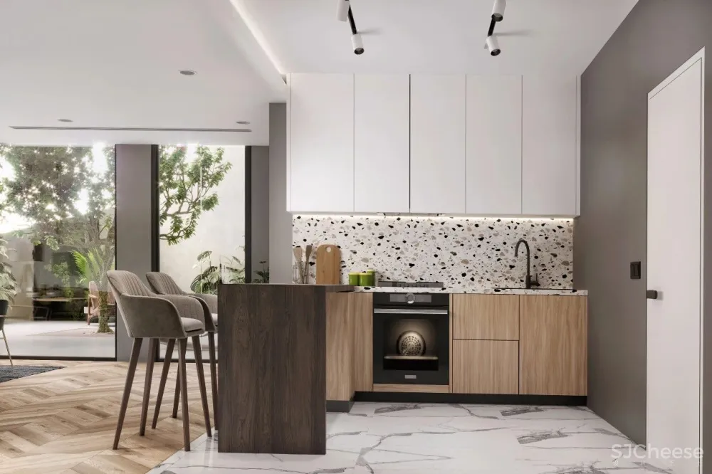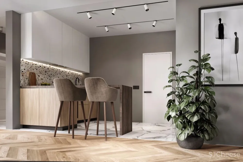 餐桌选用原木色搭配灰色地板,而座椅采用茶色和墨绿色,椅脚则用金色。橱柜选用原木色,搭配水磨石贴墙面,而咖啡色吧台柜搭配灰色长椅。一个白色柜子中央做成原木色栏栅,中间区域悬挂衣服,而一排分隔储物柜可以摆放书籍或搭配摆件等,体现主人的审美艺术。