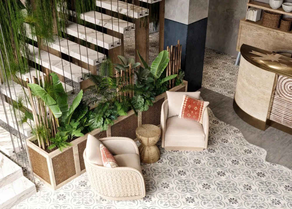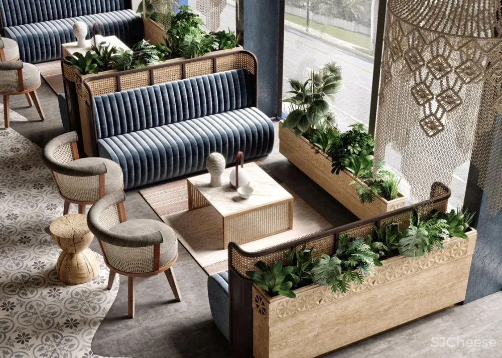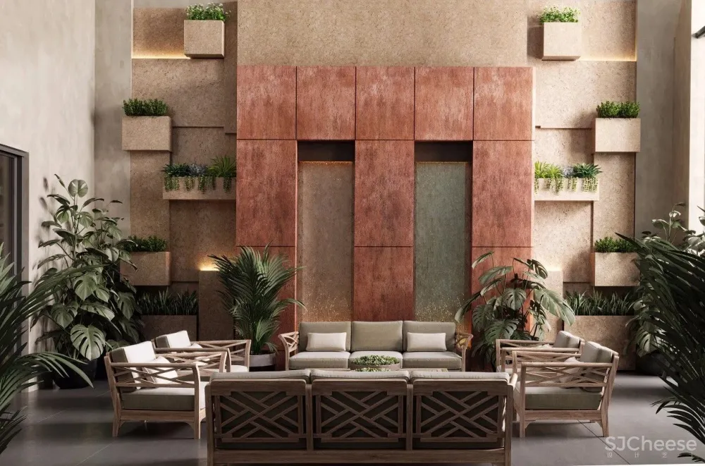 The walls above the stairs are planted with green plants, which naturally fall down to form a unique landscape. Two thick white armchairs with patterns, unfolded in the background of a green garden. The lower part of the large column is blue, and the upper part is gray, forming multiple arches, showing the grandeur of the building. The bar is also quite special. The wood ring pattern matches the stripes. The shelf for placing the cupboard in the gray background has a kind of primitive simplicity.