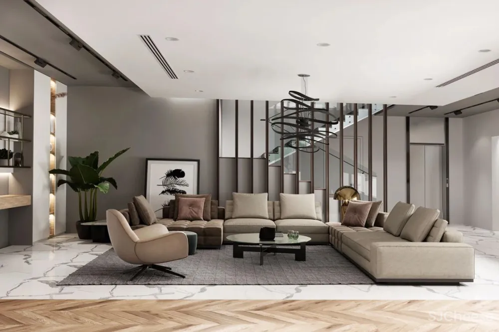 灰色一致主流色系和大地色组成的空间里,既不显得很闷又展现出高级感。暖黄色皮质沙发,搭配原木茶几桌,透明玻璃瓶里插着一些源于自然的绿植。天花板上方的透明玻璃球状灯,由一根根金属状细线牵引着。楼梯则运用栏栅隔开,也作为另一个客厅的背景,米色沙发配圆形大理石桌,黑色旋转式灯艺,充满摩登感。