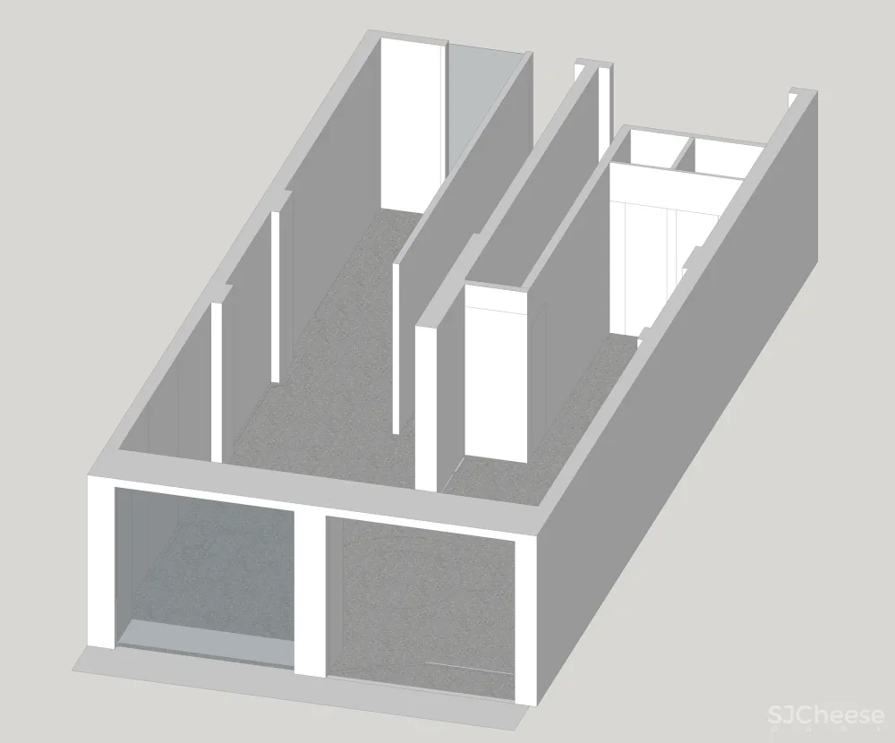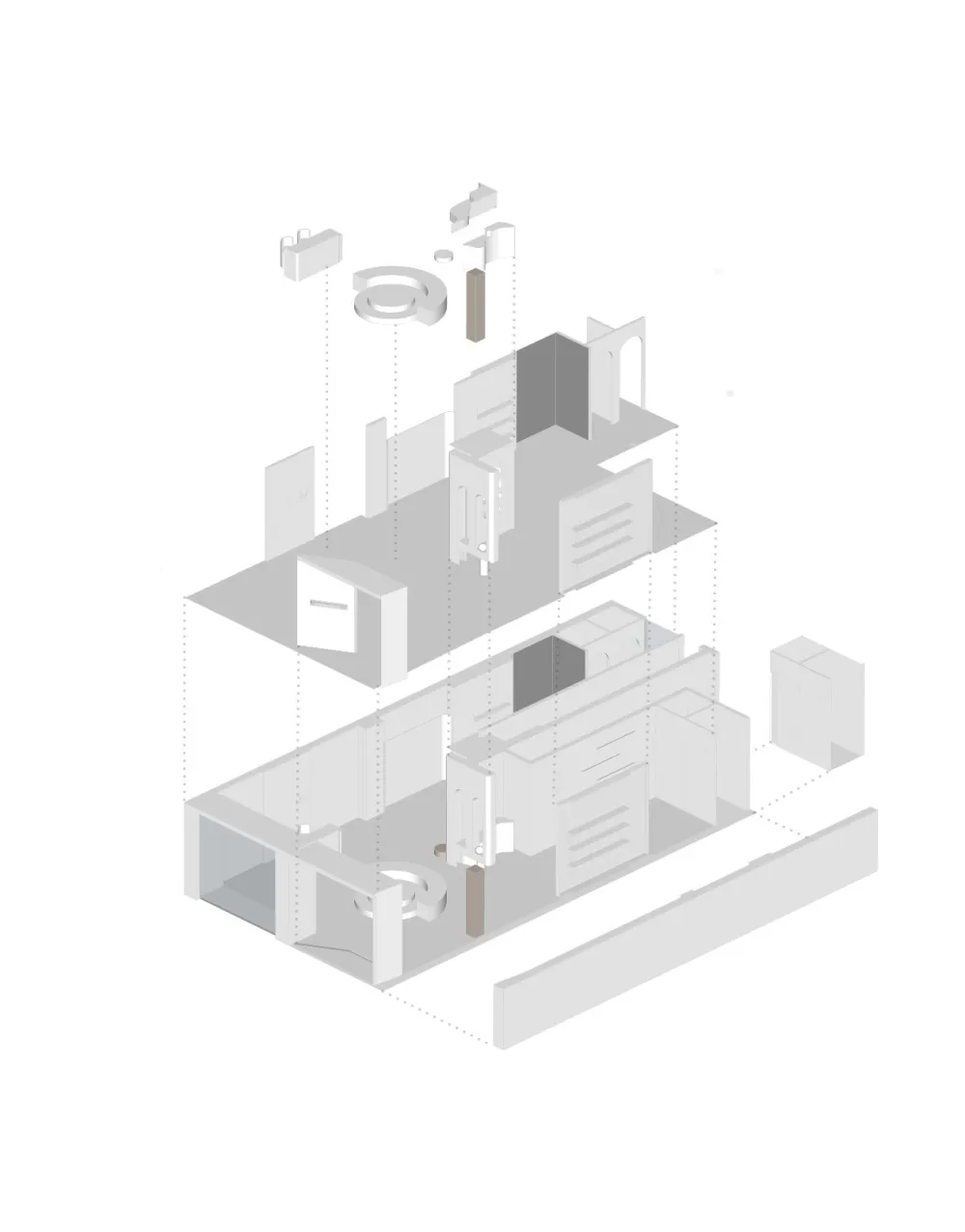 现有店面位置在老街边上,由两家店面合并改造,楼上为业主自住房与出租房,中间为通往楼上的原有楼梯位置不可改动,在设计上按现有格局上做了功能划分,将不可改动的楼梯位下面分别做了卫生间和储物空间的利用The existing storefront is located at the edge of the street, which is combined by two storefronts. The upper floor is the owners own house and rental room, and the