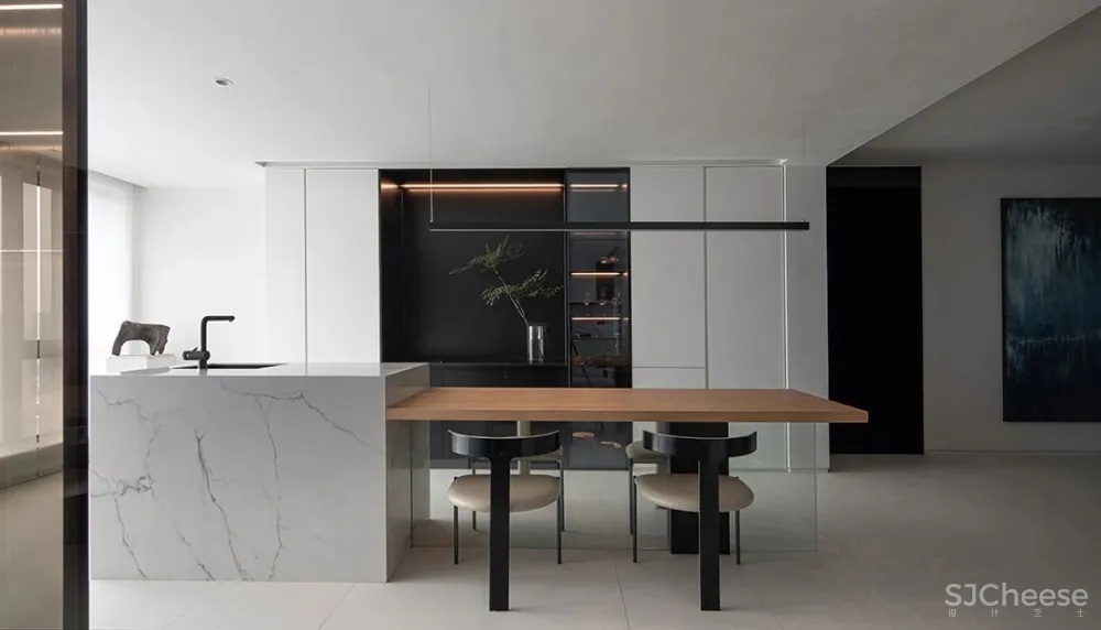 没有过多的装饰,在满足基本的生活需求之外,设计师希望主人也能与空间互动,根据喜好随心地更换艺术品与家具,时刻产生不一样的惊喜。