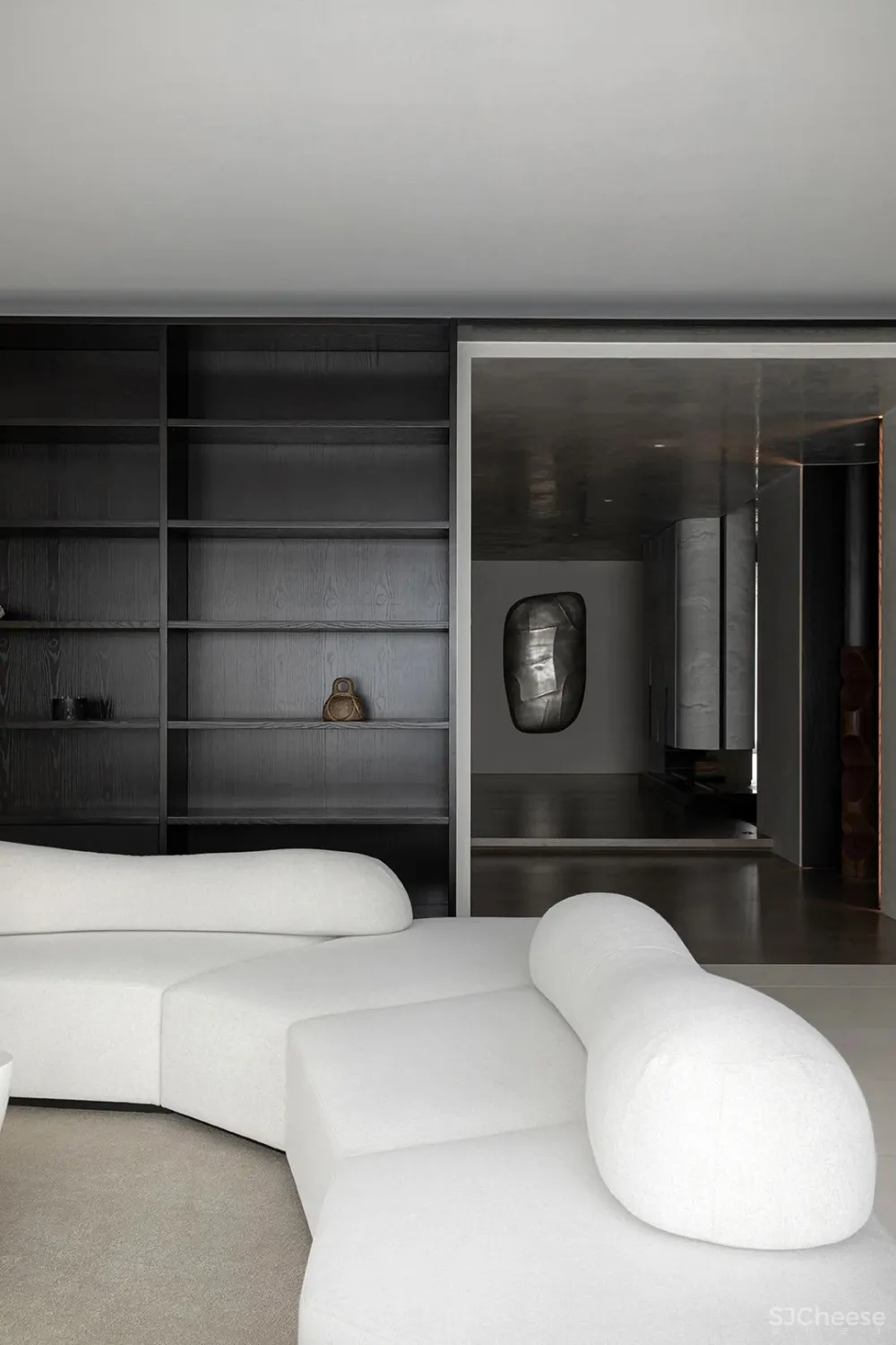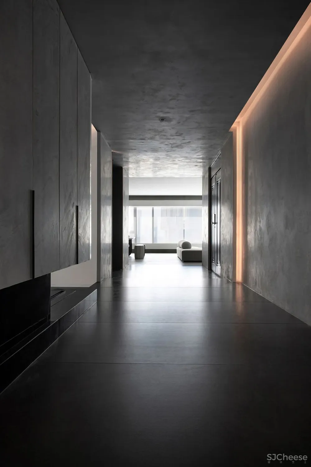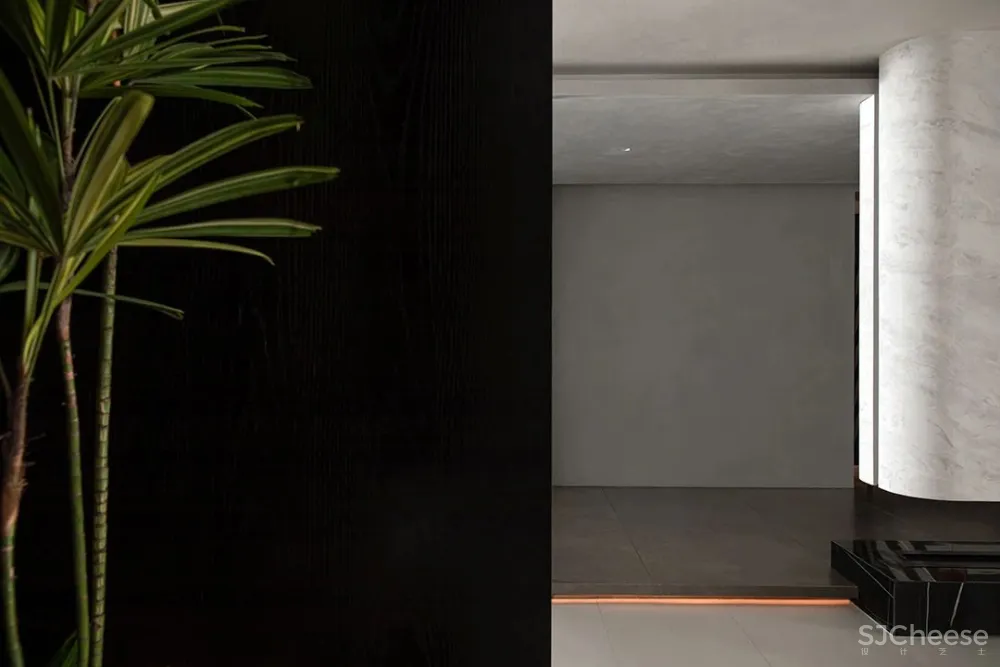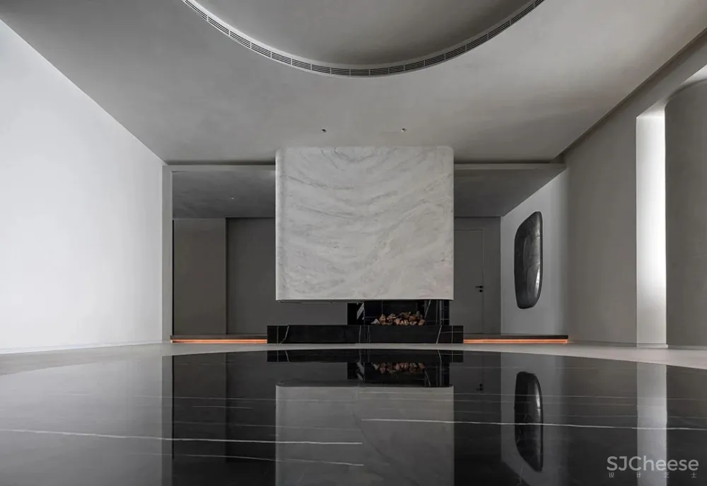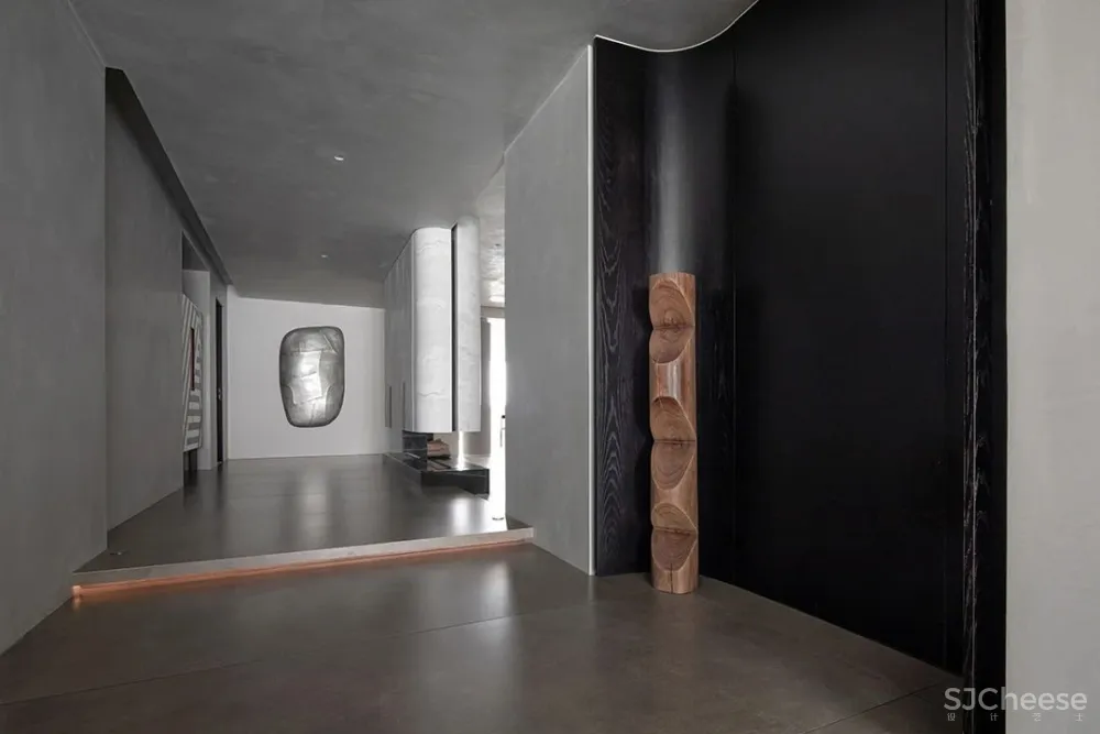 走廊作为空间的连接点,像是一座桥梁为整个空间添加创造力,其中放置了可以收纳日常用品的柜子,水滴的艺术装置,以及一面内凹的造型墙,以一种拥抱空间的姿态正对着入户门,让人感受到空间充满着原始的力量感。