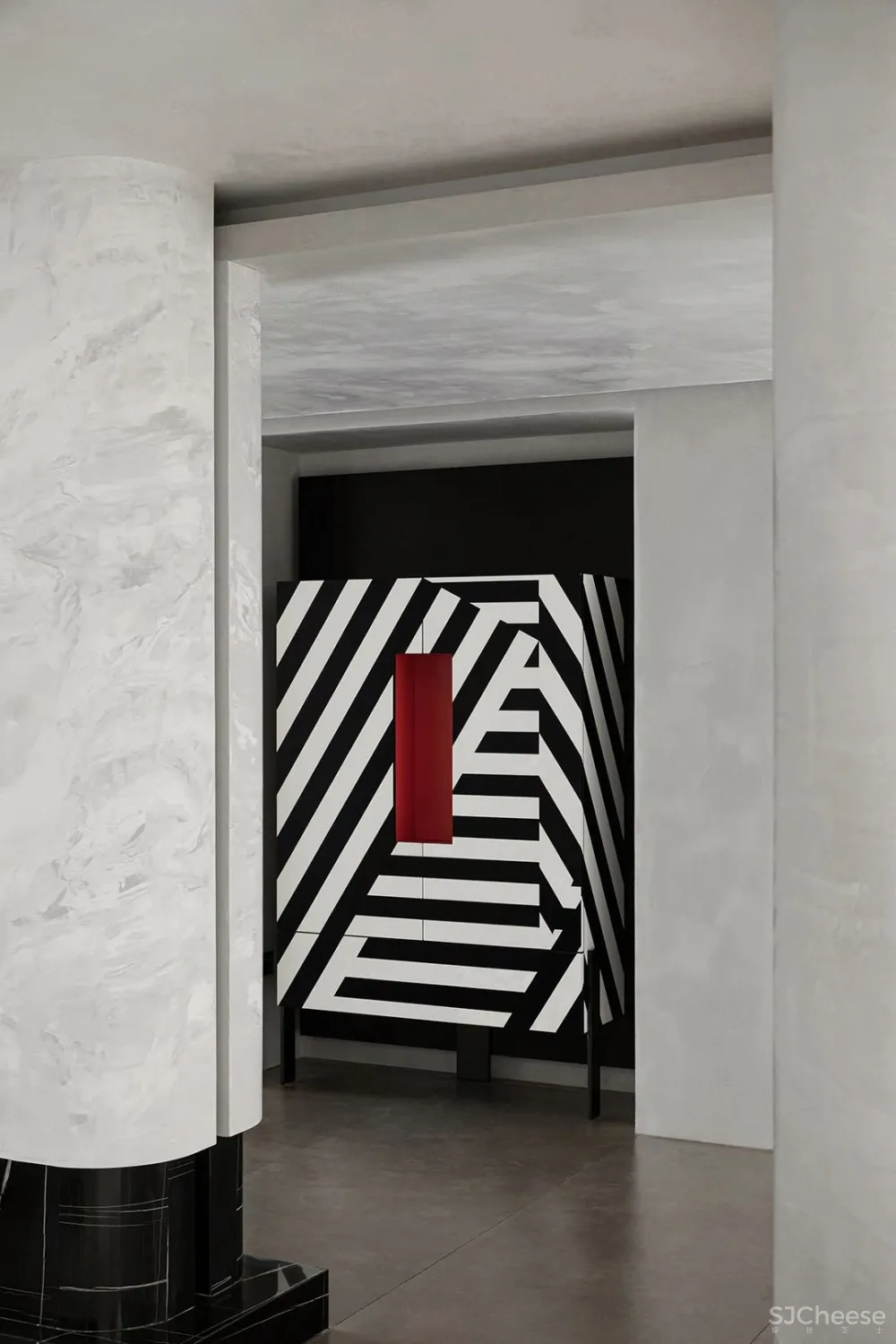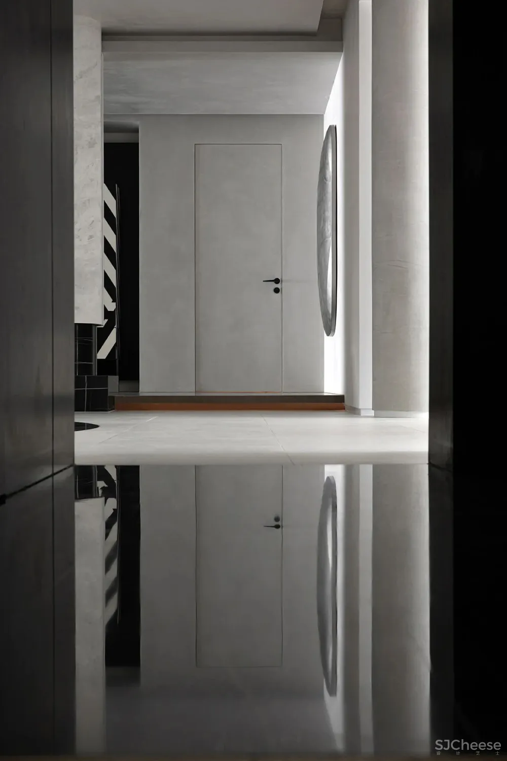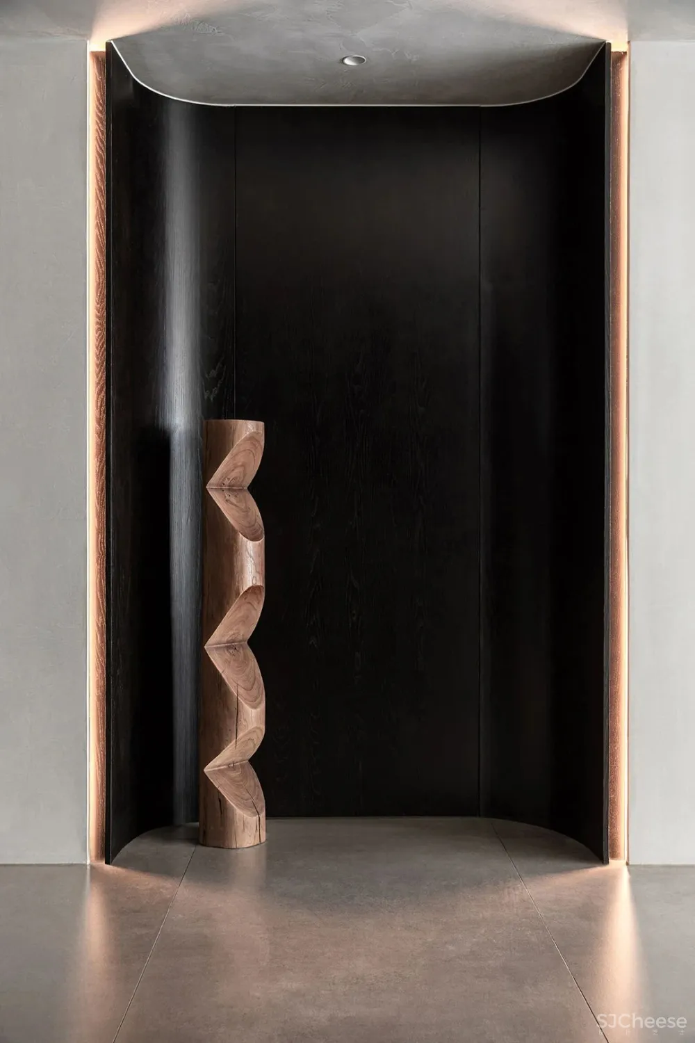 走廊作为空间的连接点,像是一座桥梁为整个空间添加创造力,其中放置了可以收纳日常用品的柜子,水滴的艺术装置,以及一面内凹的造型墙,以一种拥抱空间的姿态正对着入户门,让人感受到空间充满着原始的力量感。