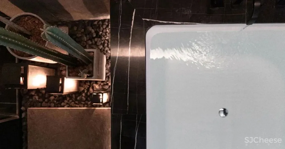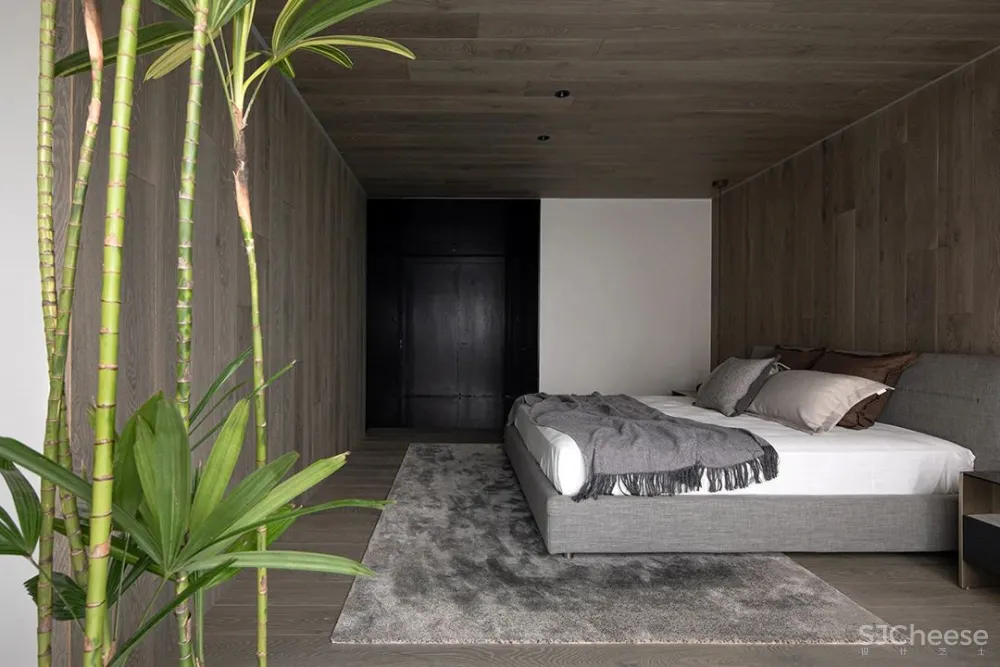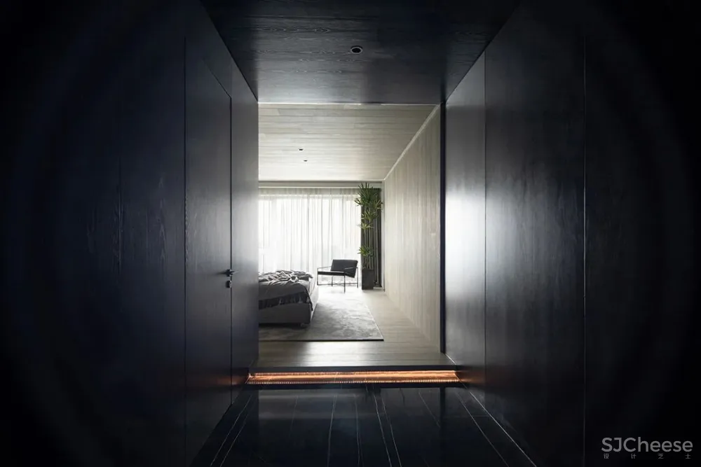 由于住宅内没有阳台空间,设计师在卧室入口打造出一片入户庭院,黑色“木盒子”将四周环境区分,铺上一块老石板,犹如在森林中穿梭。