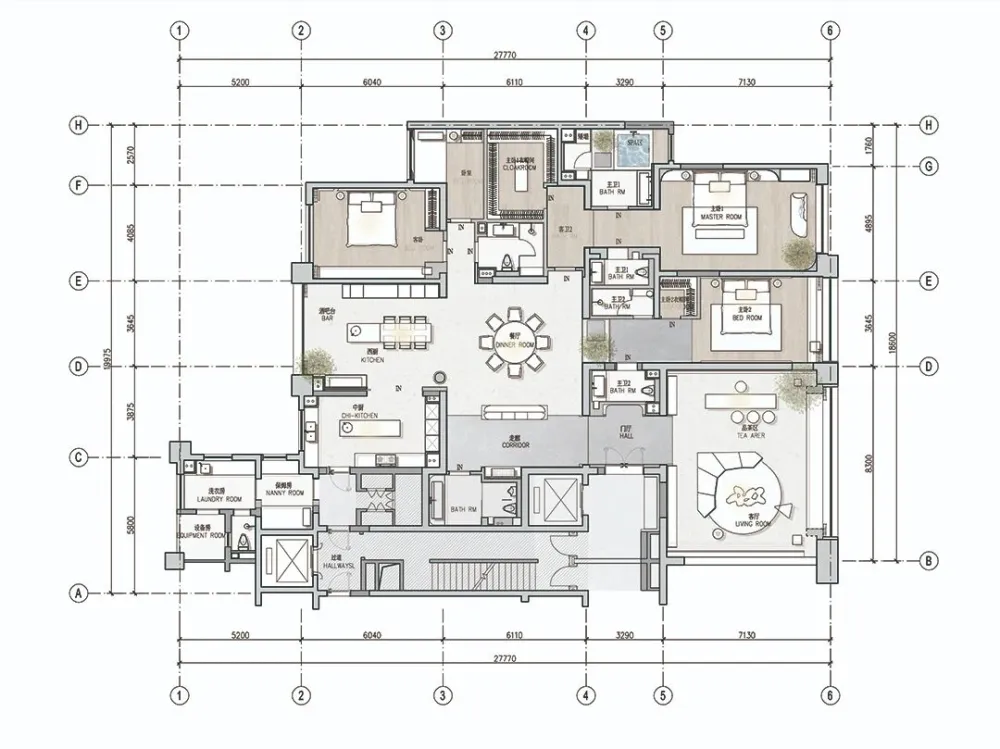 起居空间分为三个房间和一个助理房,其中为主卧重新做了分区规划,拥有衣帽间以及spa空间。