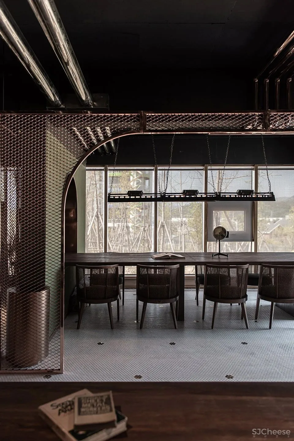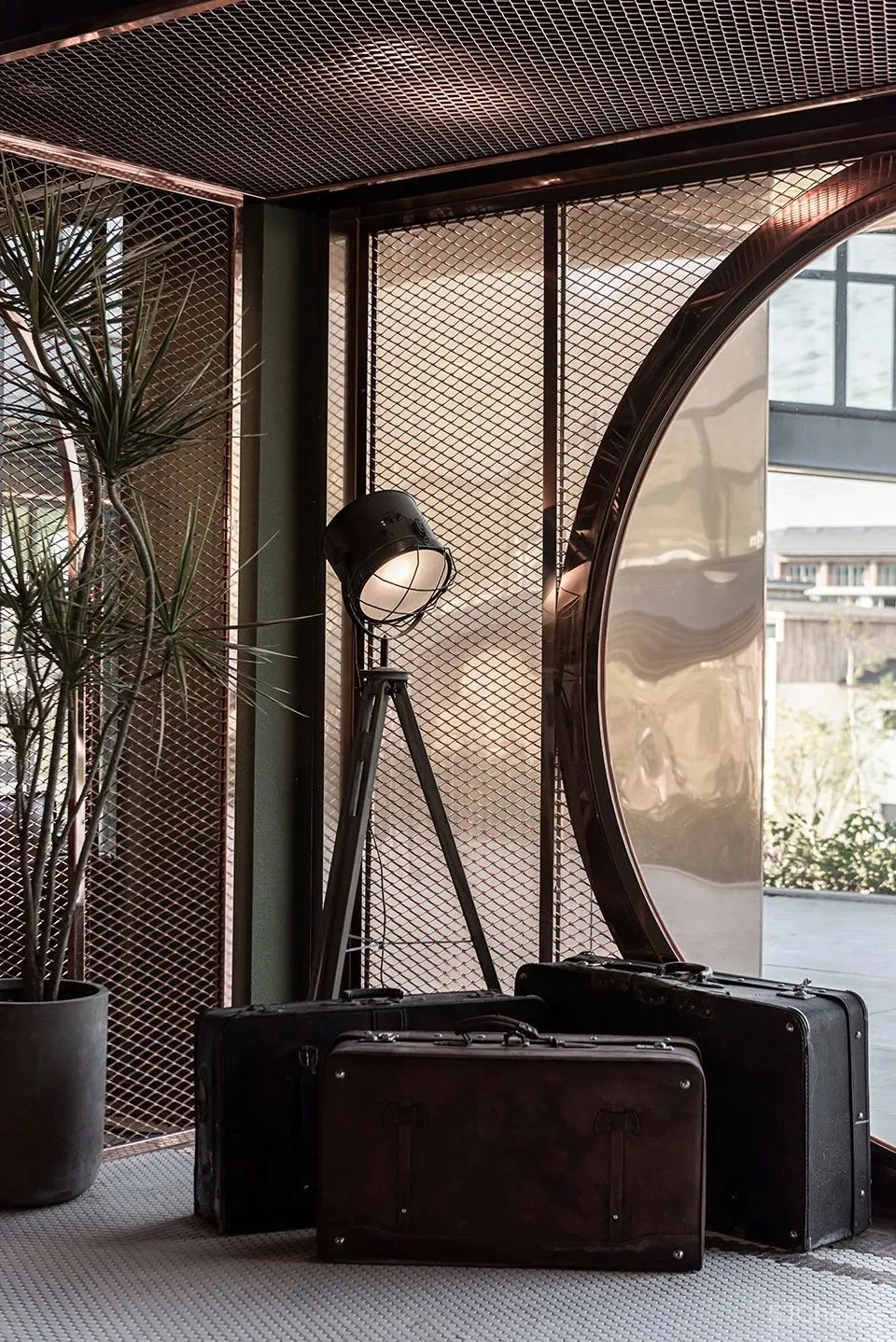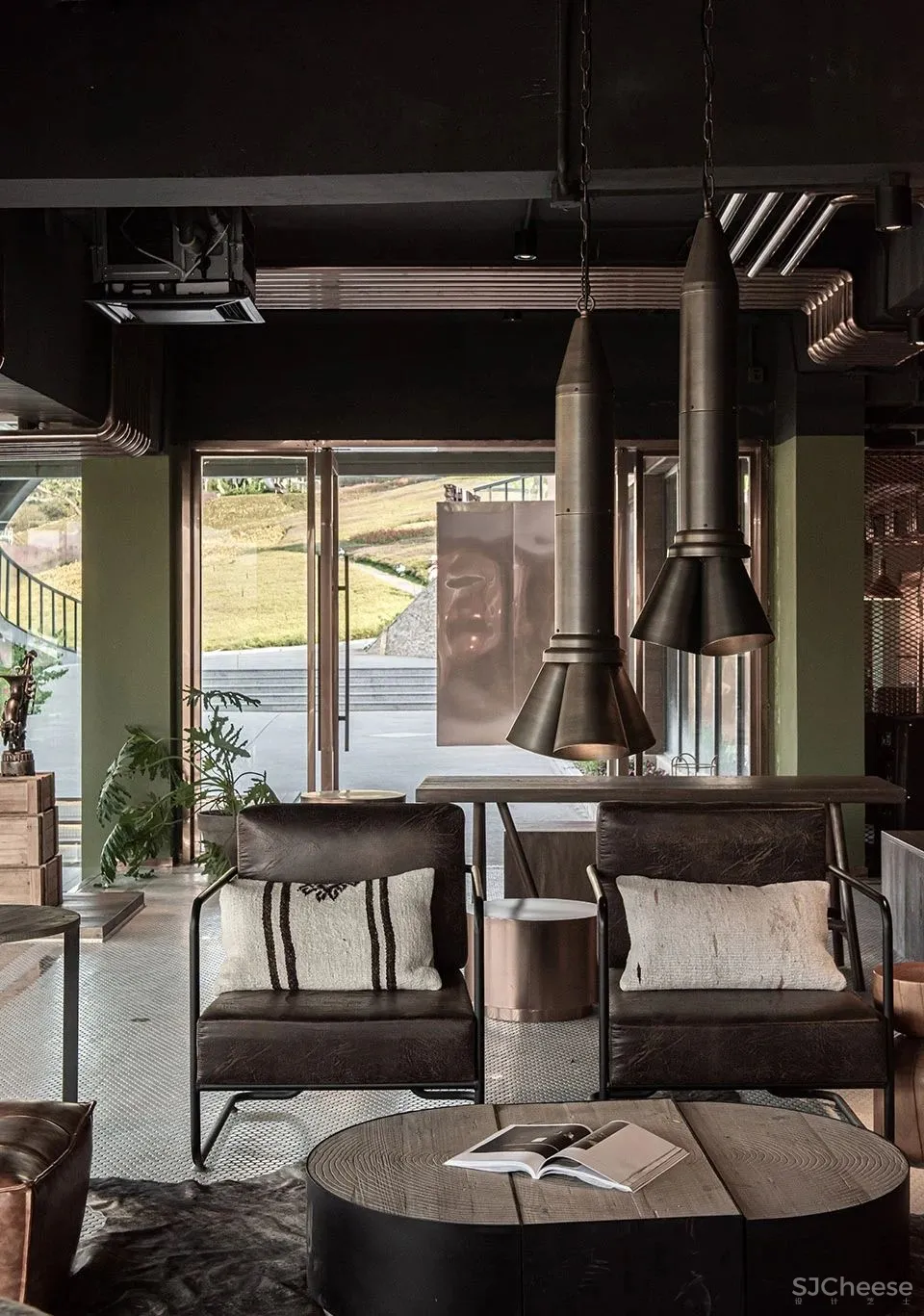 墨绿色的墙面涂料、仿古砖、木作、暖色做旧皮革中和了金属带来的冷感,点缀在空间中的黑板画、从各地淘来的旧皮箱、打字机等老物件,无不营造着一种复古工业氛围。