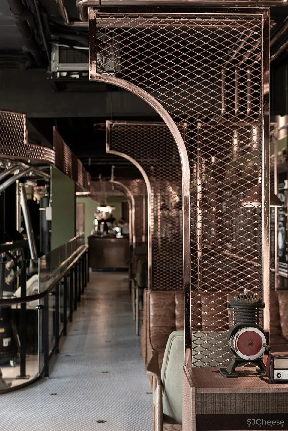 这家叫铁花的咖啡厅,连名字都很硬核,画面中是扑面而来的浓烈复古工业风。整个空间划分了操作区、休闲区、设备区和展陈区四个区域。