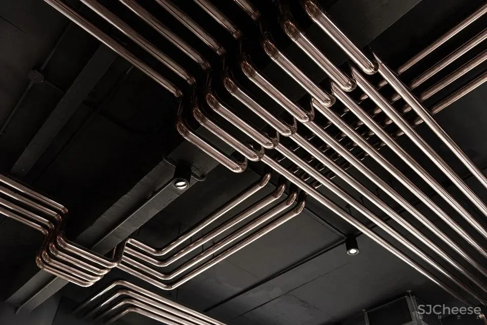 大量的金属被应用在空间中,天花板上的圆管交织穿梭,圆管延下悬挂暖黄色的灯饰,地板很特别,金属马赛克在白色上跳动,沉稳又灵动。