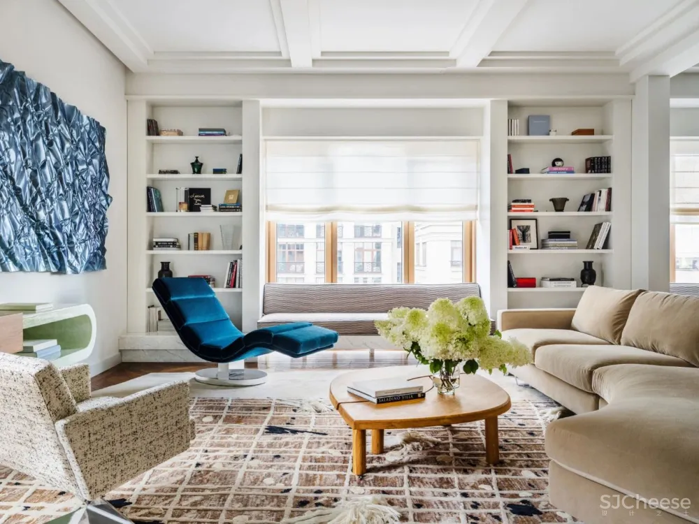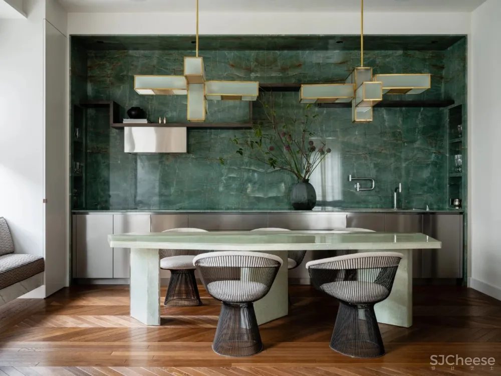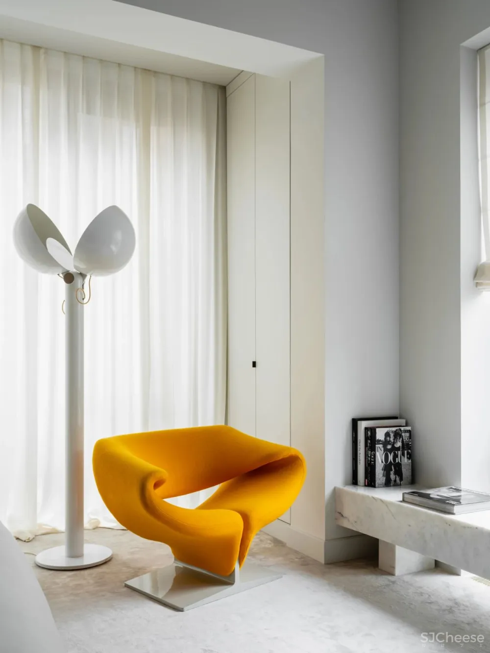 The big glass windows invite the urban landscape inside Malyeva’s home and combine with other materials such as marble. The interior designer filled her home with her favourite iconic and timeless pieces of furniture, including a Milo Baughman daybed, Warren Platner dining chairs, a Pierre Chapo T22 table and the legendary 292 Hill House 1 chairs by Charles Rennie Mackintosh, among many others.
