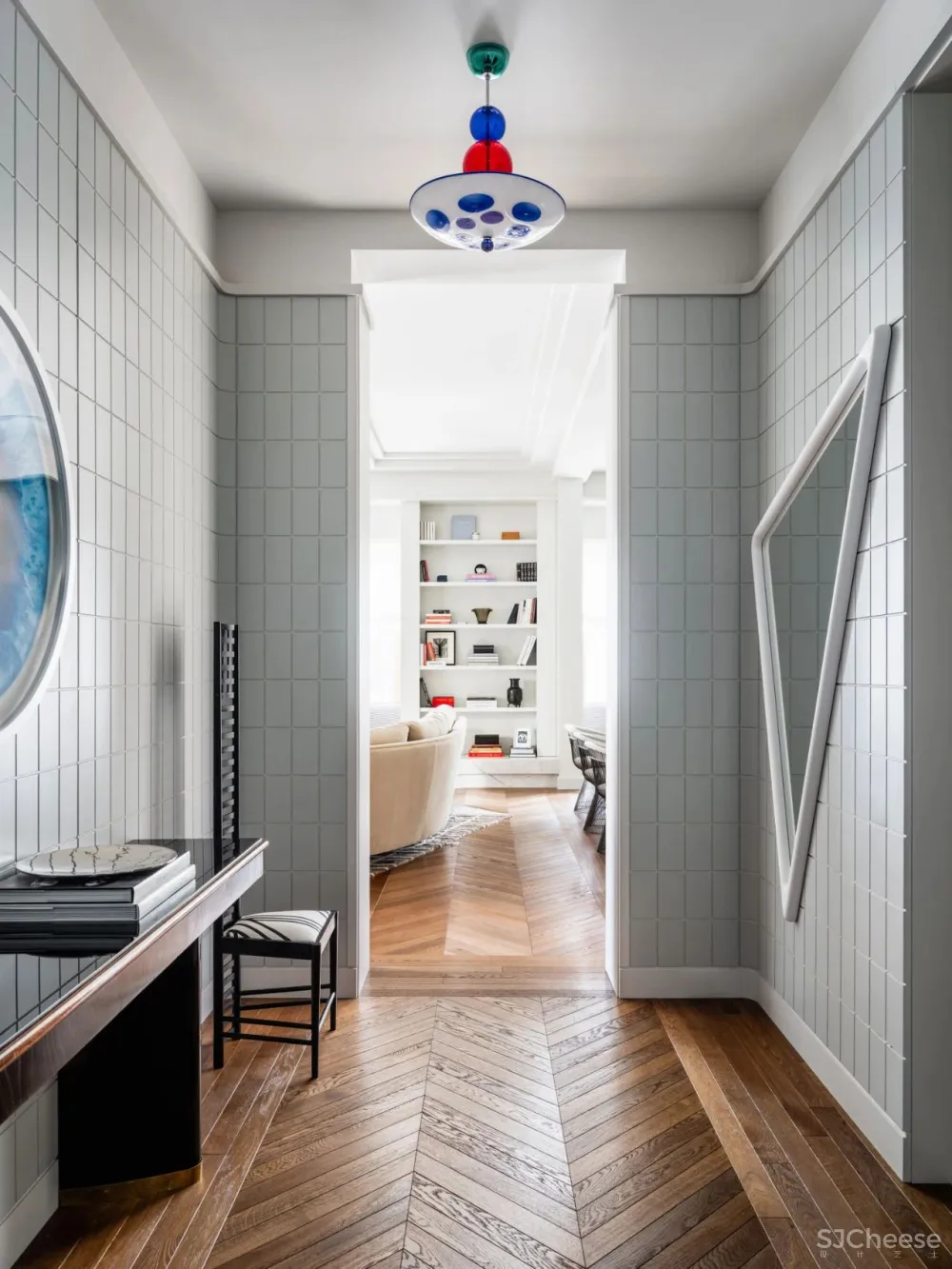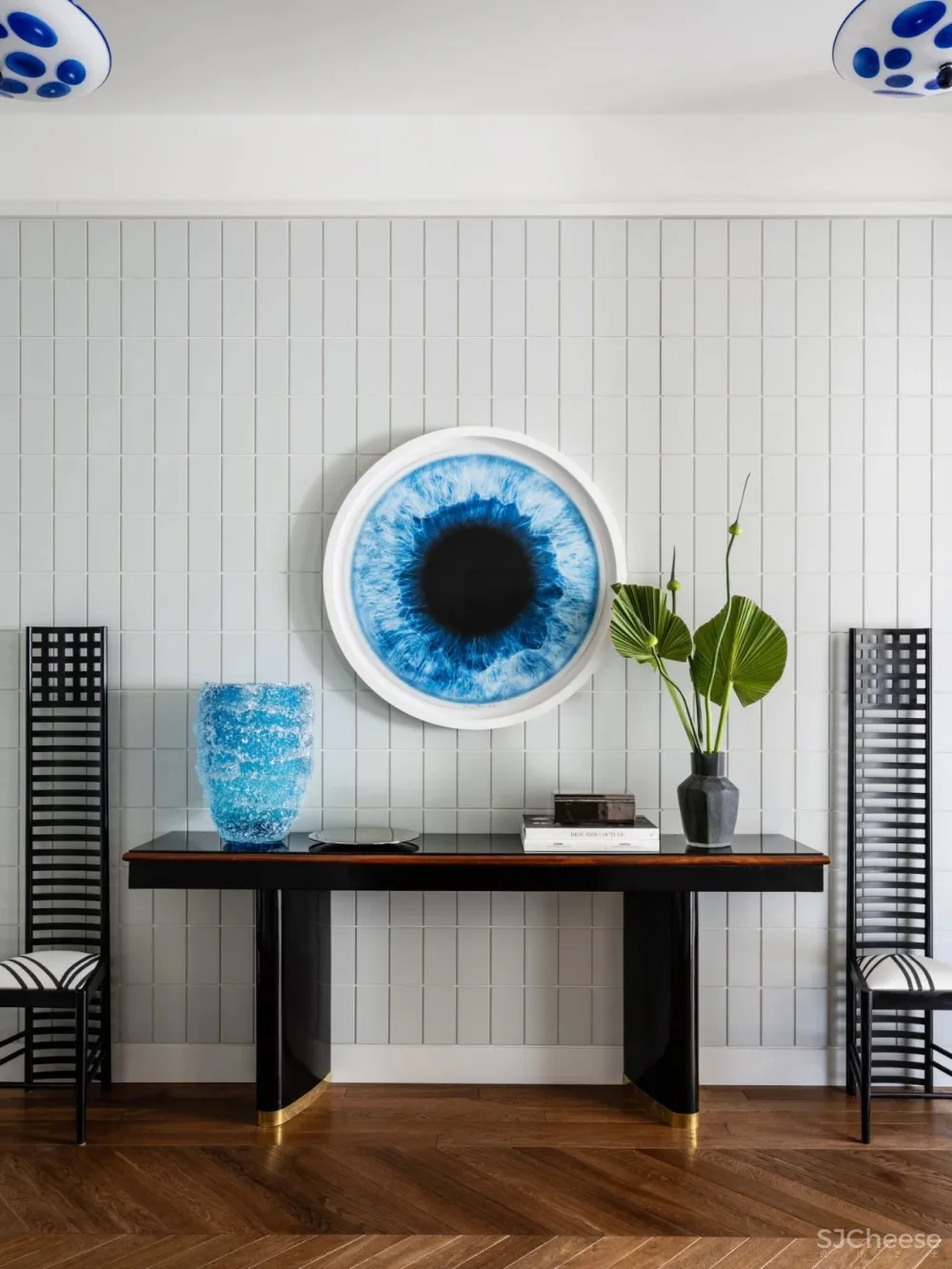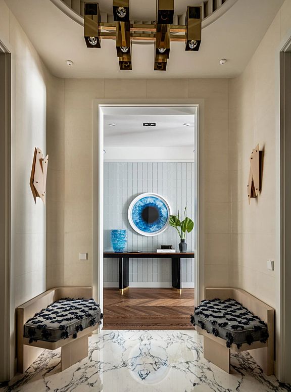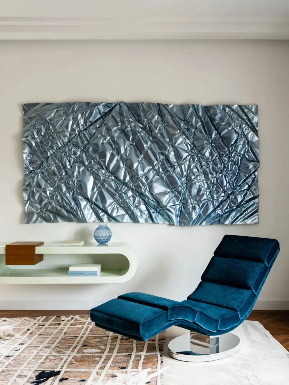 She also included bespoke furniture which she designed and which was produced by artisans, such as wall installations (in the master bedroom, “Les Papillons”, made from handcrafted fused glass, imitates the silhouette of a butterfly); custom lighting (inspired by the ice crystals of Russia’s Lake Baikal, the pair of wall lights “Morceau de Glace” is sculptural); and expssive carpets.