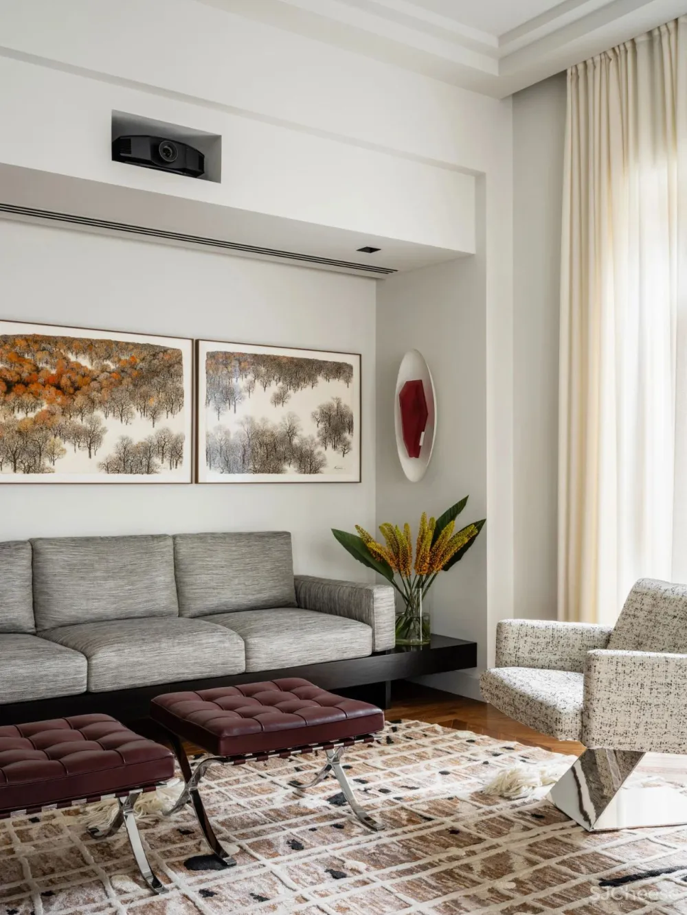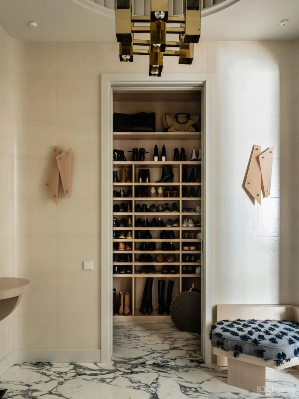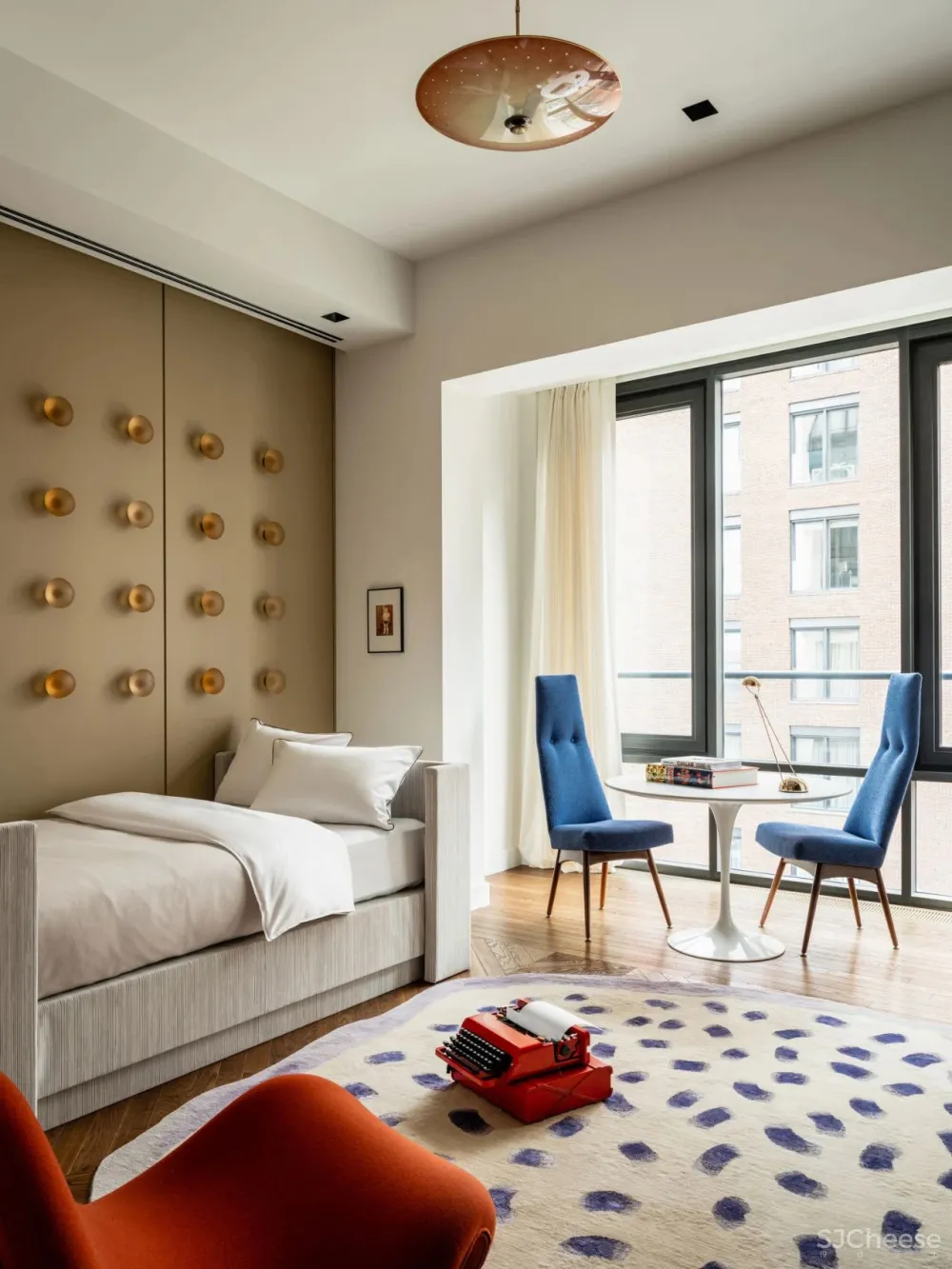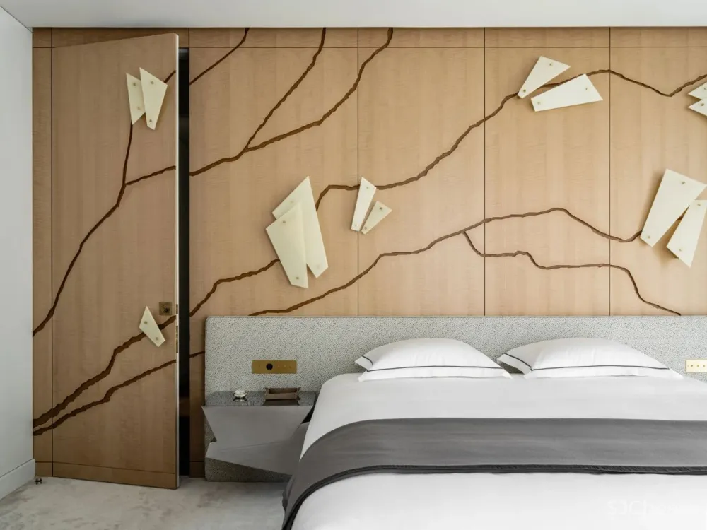She also included bespoke furniture which she designed and which was produced by artisans, such as wall installations (in the master bedroom, “Les Papillons”, made from handcrafted fused glass, imitates the silhouette of a butterfly); custom lighting (inspired by the ice crystals of Russia’s Lake Baikal, the pair of wall lights “Morceau de Glace” is sculptural); and expssive carpets.