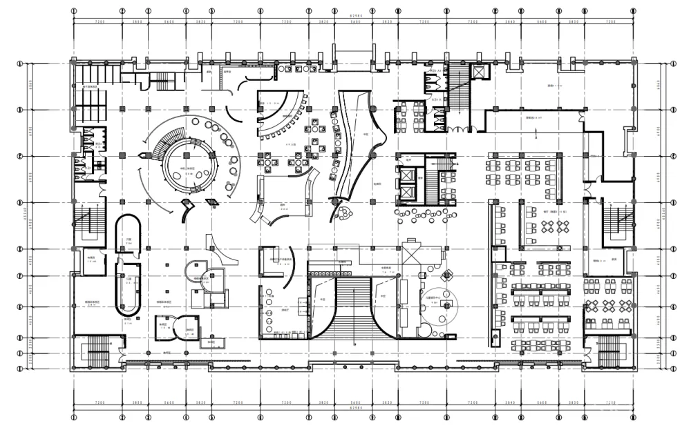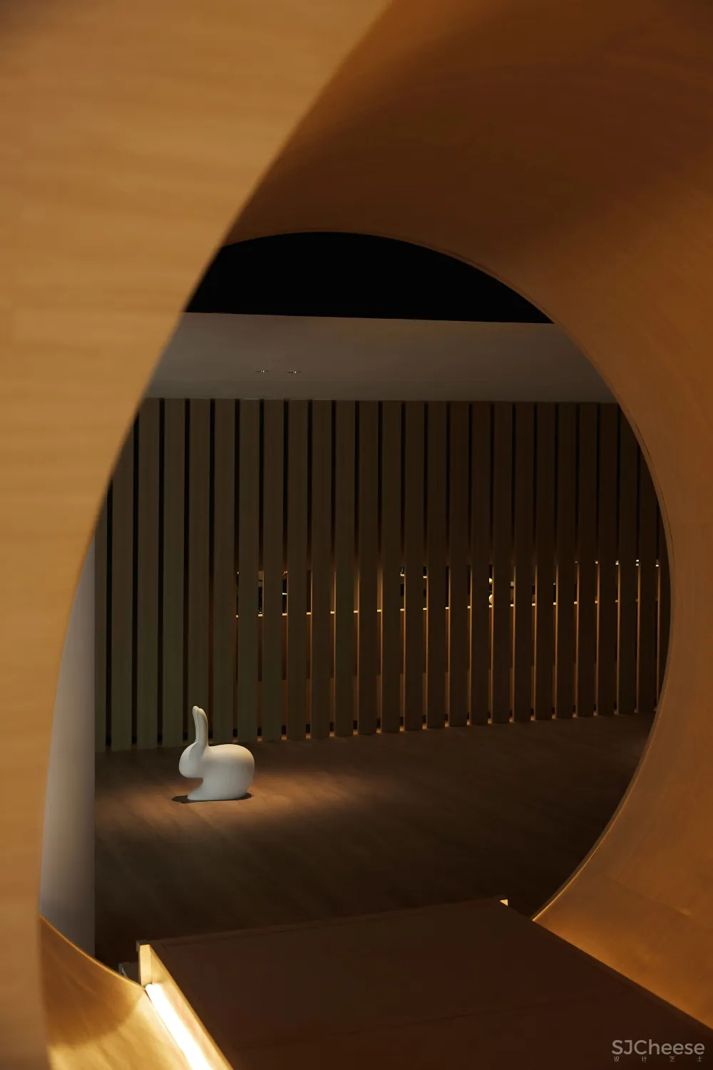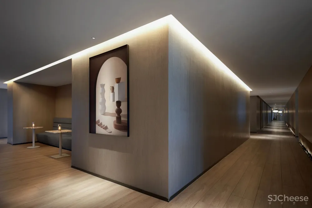 被景观楼梯自然分割的两侧空间,是主要活动区。它们像城镇街区围绕着主城区“广场”向外生长,功能之间的动线如川流不息的“街道”。这其中最惹人逗留的是“树洞”长廊,它位于餐厅和水吧之间,以“儿童乐园”的名义存在。几何简化后、树洞般的的长廊形式感强、层次丰富,提供多种独特角度,许多人在这里拍出了不输杂志封面的大片!