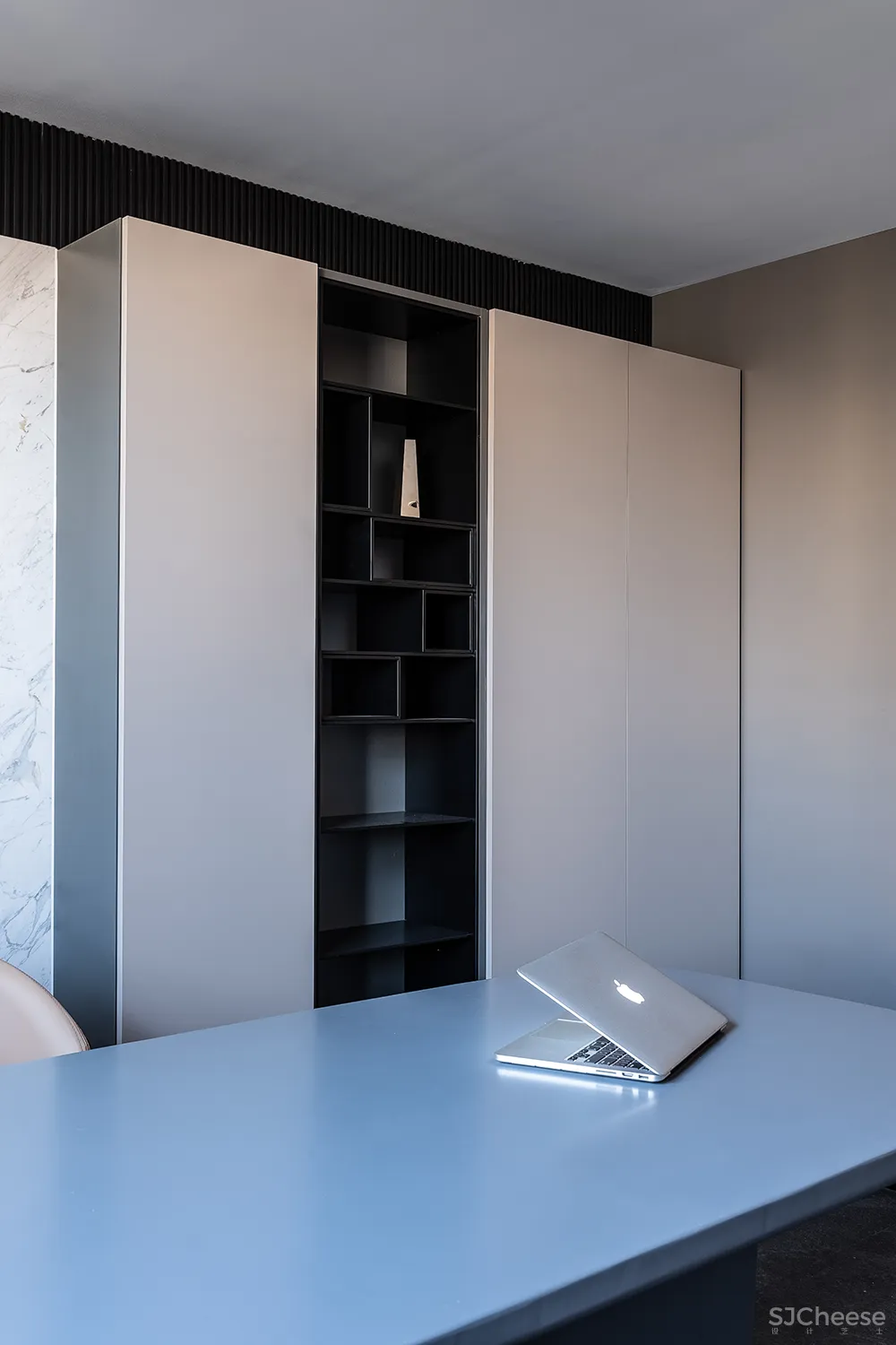 在大面积通透的空间格局上,线框的匠心勾勒,达成一个个独立功能的空间分割。整个系统在黑白灰色的严谨中又处处有点缀埋笔下细节趣味。