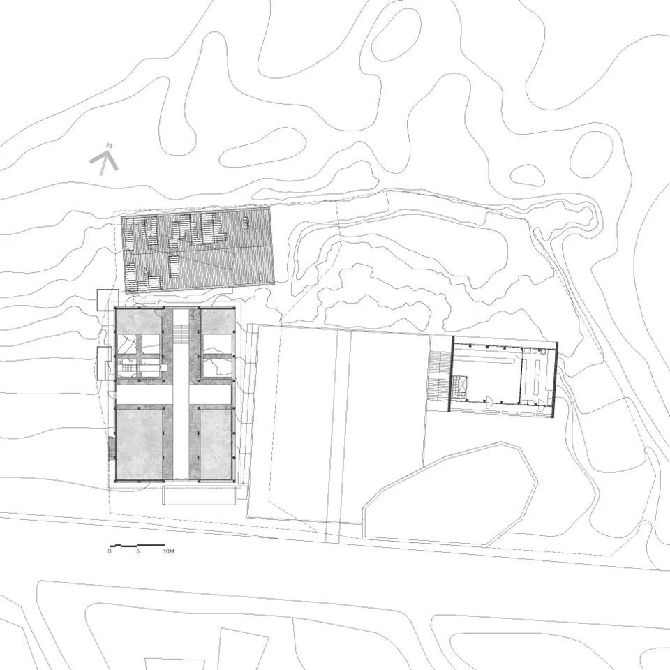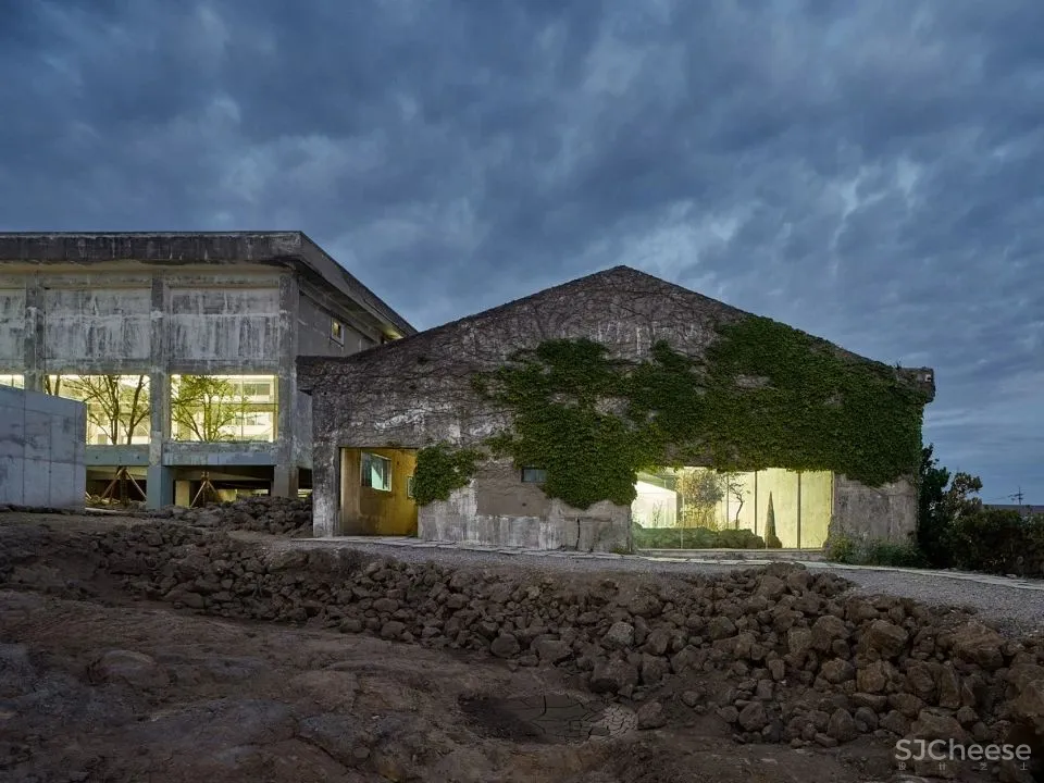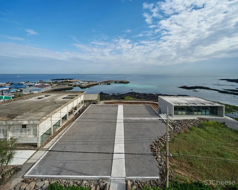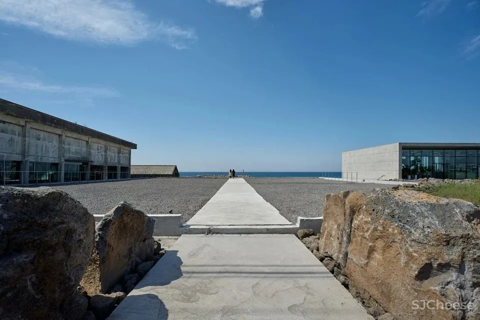 基地位于济州岛东北侧的滨海小镇Dongbok-ri的尽端。邻近海岸线的斜坡上时常刮风,花草树木被吹得几乎倒向一侧地面,两座仓库屹立其中,与周围的景观格格不入。它们曾是1982年建造的冷库,建筑师第一次看到这些废墟时,整个场地散发出荒凉感。改造中难免要面对“舍弃什么、创造什么”的问题,建筑师想要紧紧抓住由废墟激起的情感,在仓库中建立新的叙述,使人以新的方式重新体验废墟。