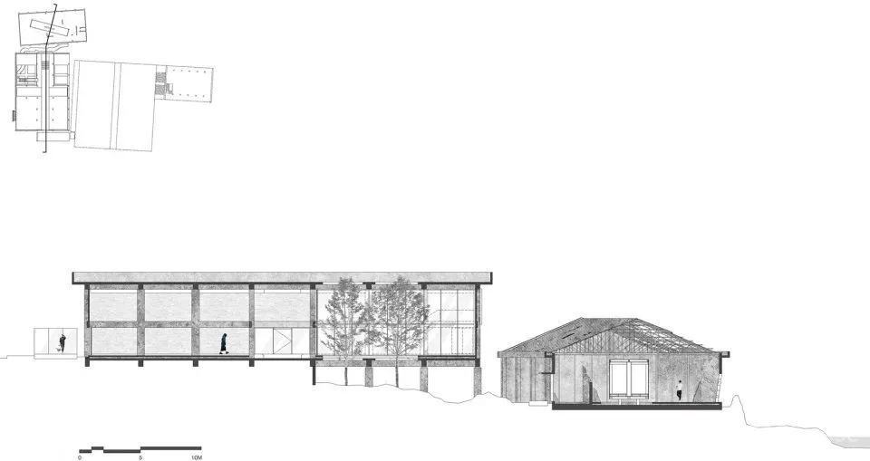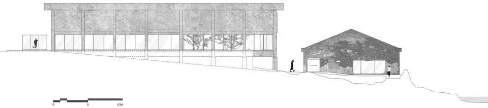 第二座仓库采用相同的设计原则,建筑师保留了间距两米的屋顶桁架和开设洞口的石板瓦屋顶,并且使从水泥板穿过的树保持原状。尽管这里缺乏海景,但它暴露在雨水和阳光中,连同远处的海浪声一起触发了荒凉的废墟感。