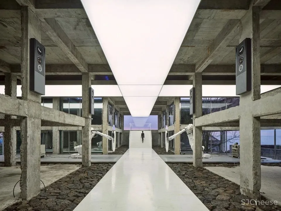 建筑师以上述分析预测模型为基础,确定了叙事的空间方向和序列结构。改造以在废墟中寻找自我为主题,并通过两座建筑的序列规划来传递叙事性。不同的符号代替了周围的环境和建筑空间,诸如广袤无垠的海平面、触不可及的天空、令人压抑的空间、老旧材料的有限寿命、金属的锋芒、没有方向的森林以及序列中隐藏的反光玻璃,在背景板中映出观者自己。观者在经历了一系列变化背景后,体验不断地向自我转化。为了使整个过程更加精确,建筑师将反光玻璃结合人工照明,使其可以根据环境亮度调节反射、透射和重叠的效果。
