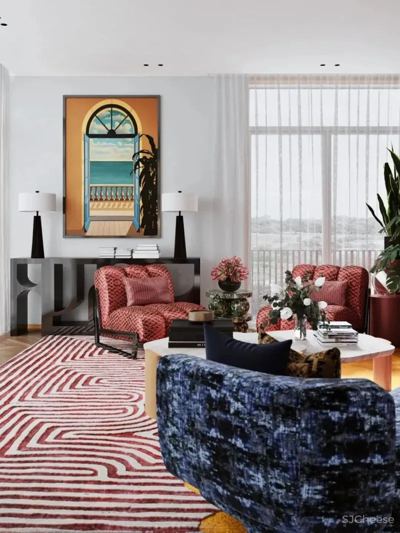 大胆的用色,个性的家居让整个空间充满了艺术感。进入公寓,映入眼帘的是顶天立地的铜像,玄关的中间用一堵墨绿色的大理石墙做了分割。进门换鞋去的彩色玻璃柜、舒适的椅子和返璞归真的花瓶,进门就给人一个舒适感。