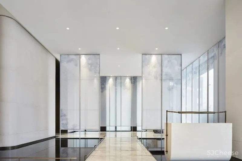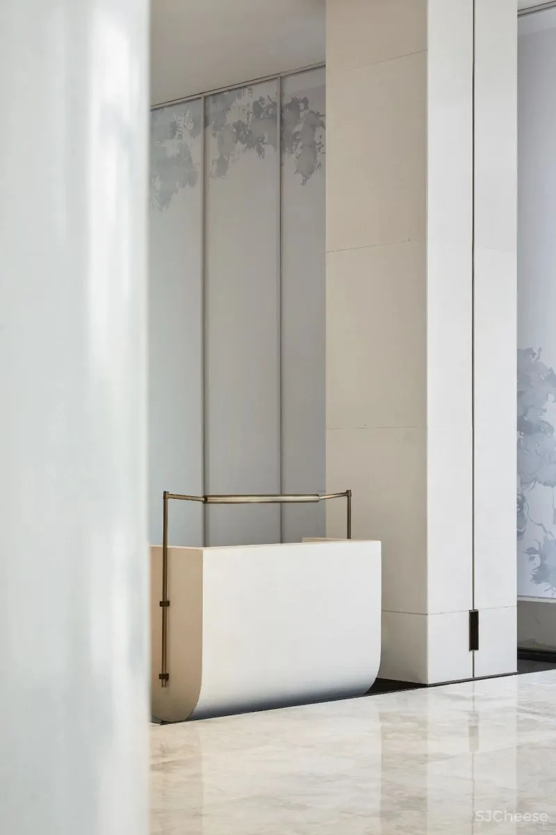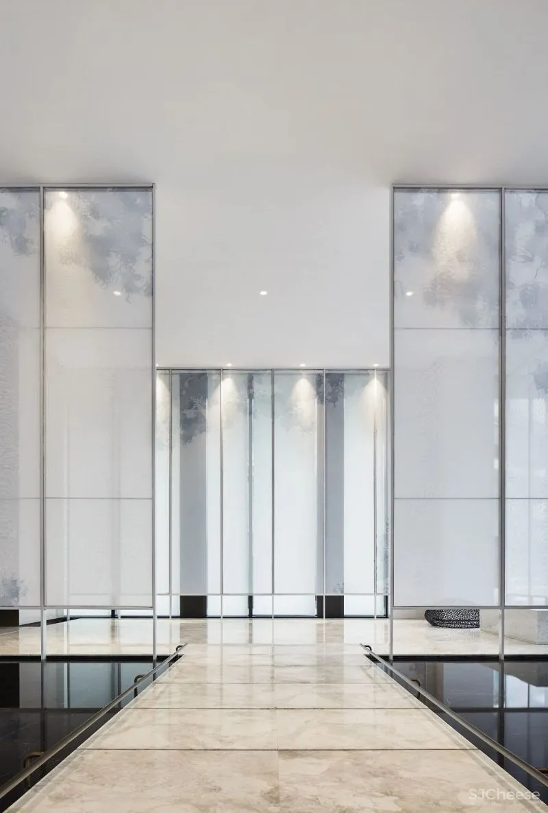 取自蜀地色彩基调,过厅处采用艺术家Laurent Lo 的线形装置风格,一面黑色,一面电镀金,增加雕塑的细节以及华丽感,整个雕塑悬浮在半透的帘幕前及水面上,整体空间有着非常分明的层次关系。