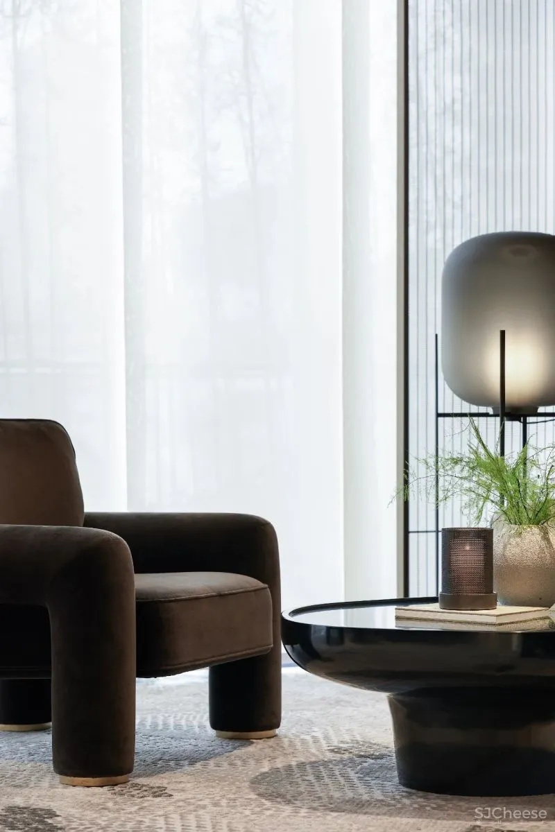 材质上,在带有纹理性的橡木、大块的水磨石咖啡桌、暗褐色的磨砂皮质沙发基础之上,设计师加入蜀锦的抽象图案,运用琉璃、碳化木以及金属细节,由小及大,穿插其中,充盈整个空间的价值感。