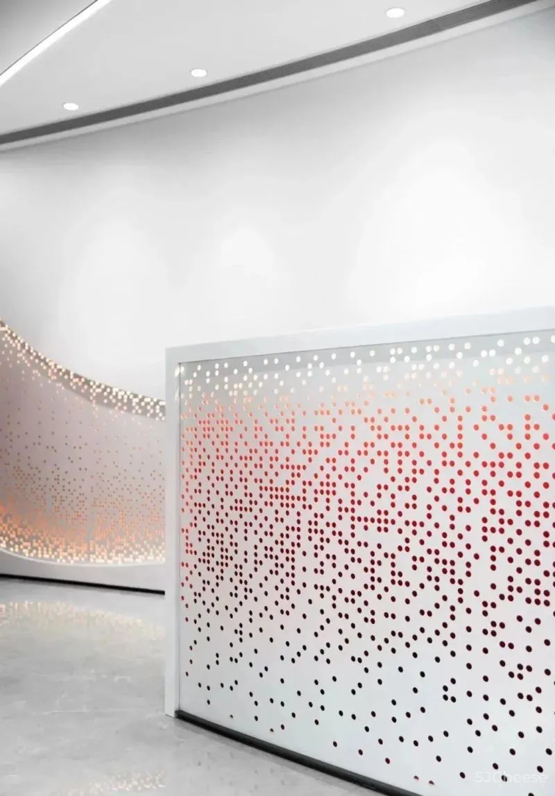 通过不同大小和密度的冲孔排列形成的整个曲面的背景墙,在平面上由图案元素形成一条连贯的冲孔曲线,细节处理用来体现背景墙的立体层次感,连接着左右两边对称的走道。