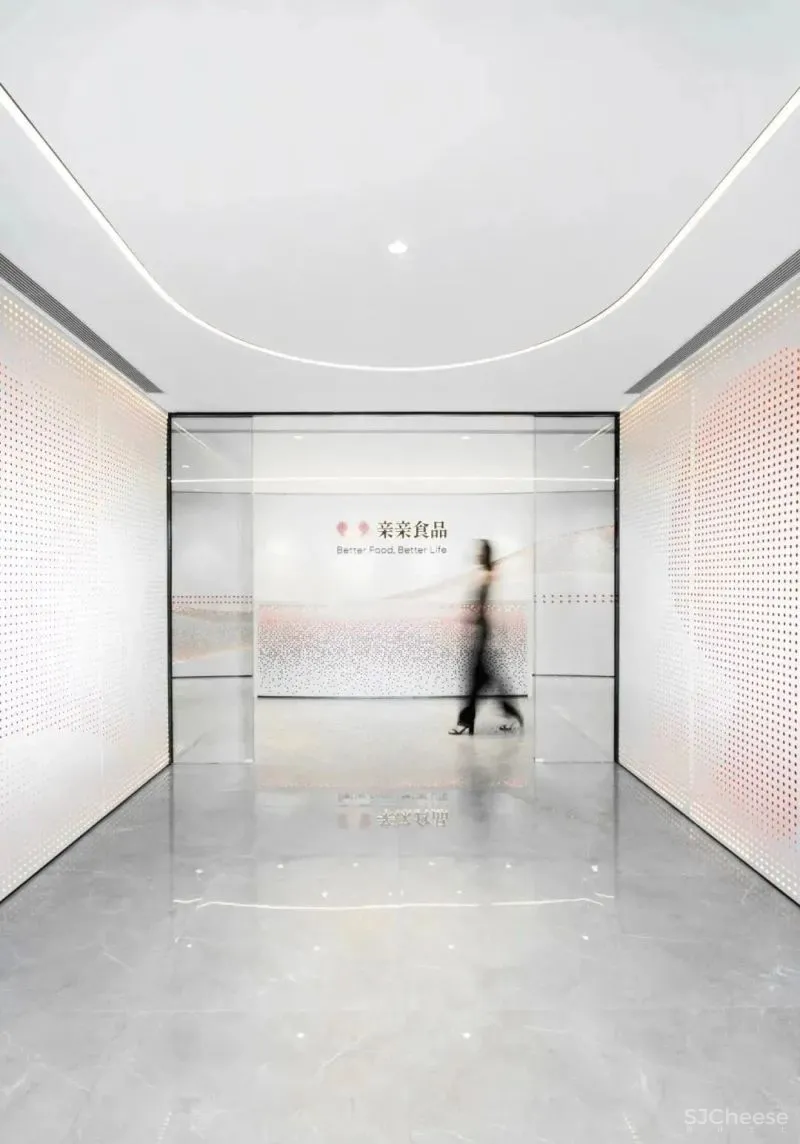 进入办公室的电梯间由印有亲亲品牌图案的白色冲孔板墙面装饰,在上下灯带和红色背景的映衬中掩映渐变的品牌图案肌理。通过玻璃门进入同样采用冲孔板材料的接待台后,可以清晰感知到整个设计的延续性。