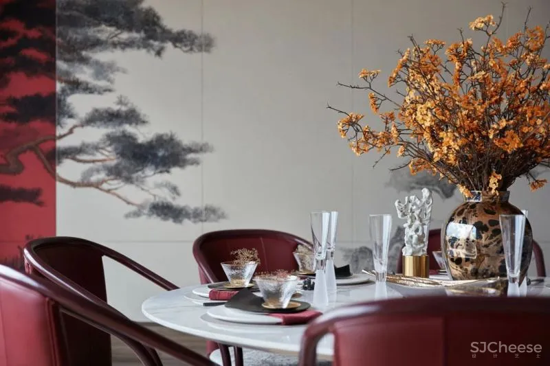宴会厅非常讲究空间的层次感与秩序性,采用对称的陈设布局,背景墙搭配别具特色的陈设、装饰画,让空间大而不空、厚而不重,集现代、雅趣于一体。