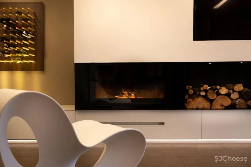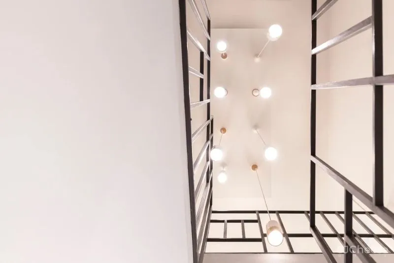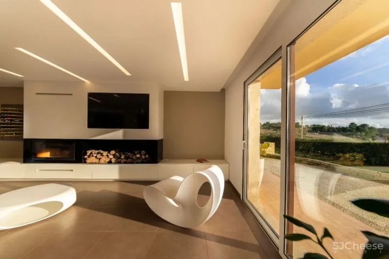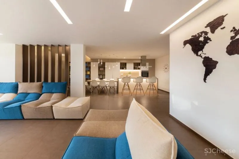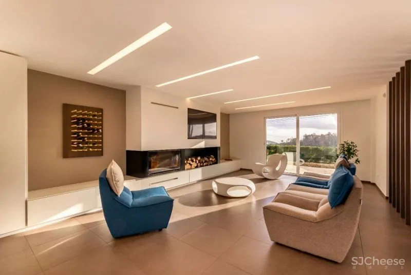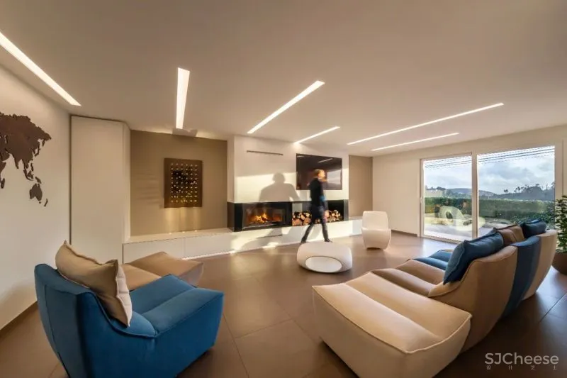 在客厅,墙壁在沙发前延续,并设有一个带木隔间的大壁炉和一台LED电视。照明非常重要,吊灯和天花板上的光有助于区分照明区域,从而使环境在各种用途上更加灵活。