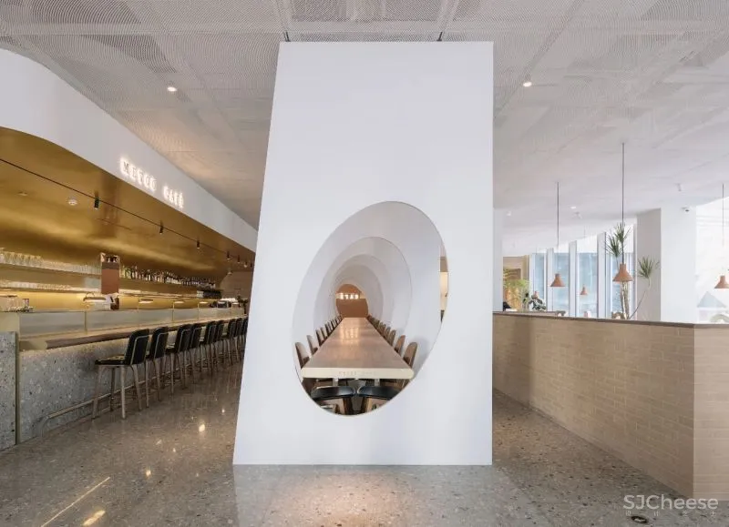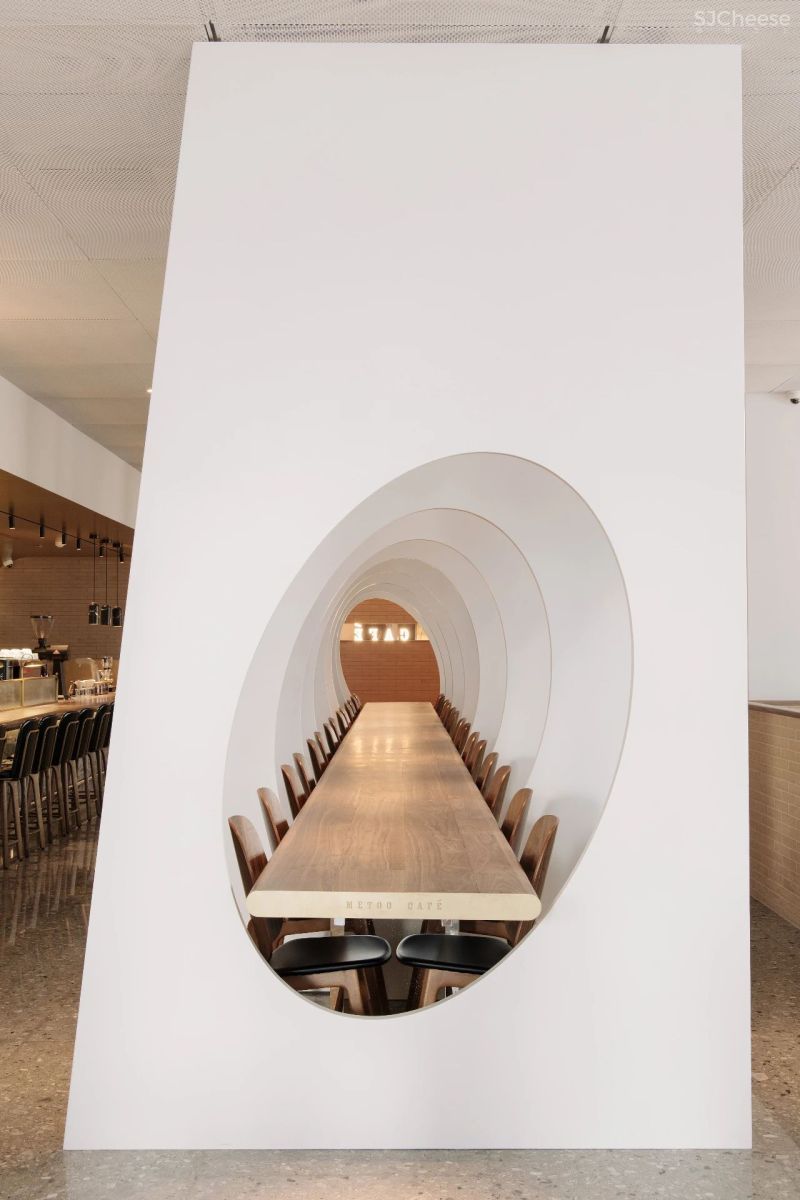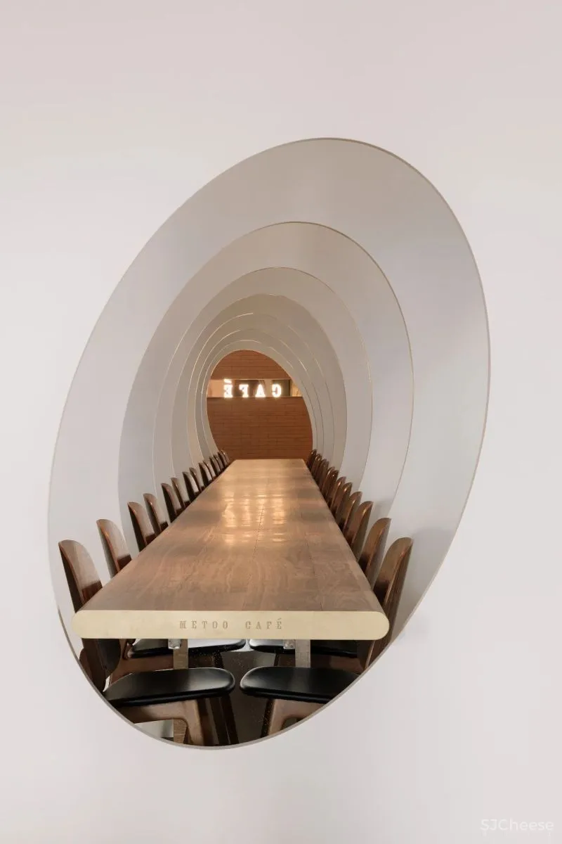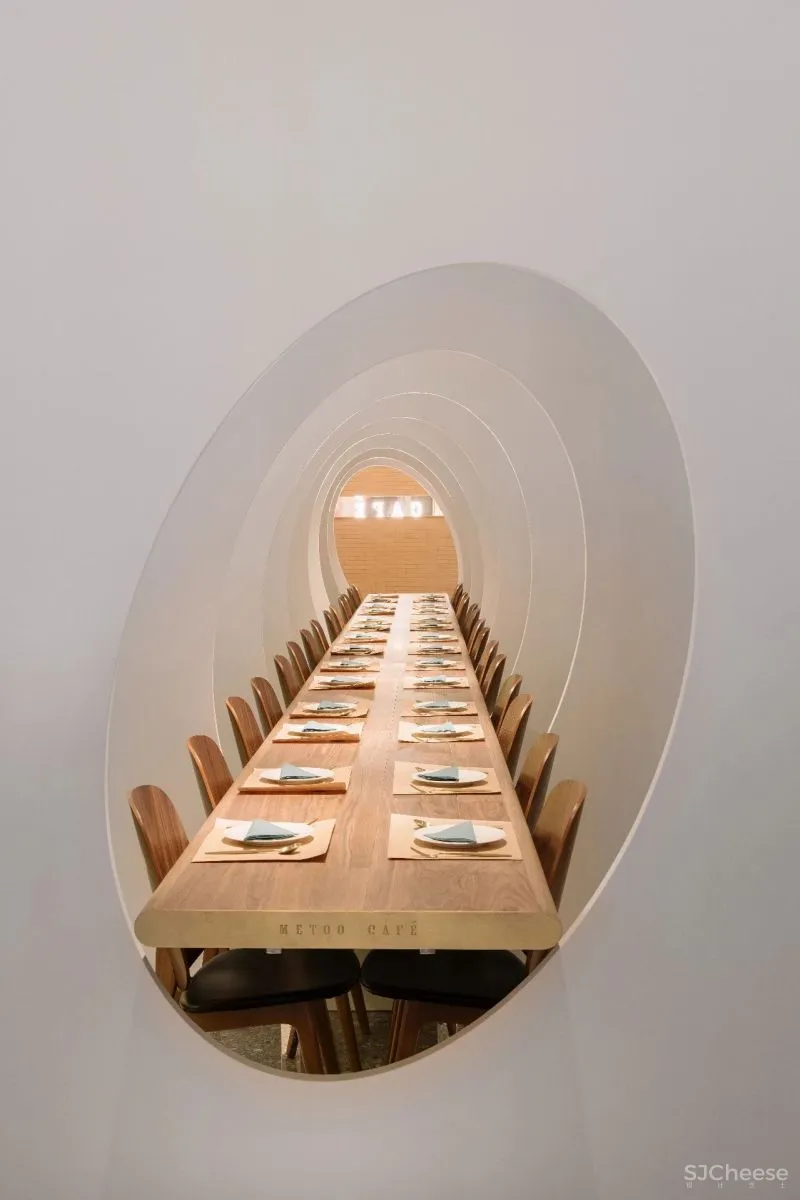 华夏之心店里,有一个特殊的白色装置设计,8块通顶高的白色铝板,将中间镂空并旋转构成白色旋涡,12米超长餐桌从倾斜的圆弧中穿过,我们称之为时空隧道。餐桌之所以长度12米,是象征着蜜桃一路走来的这十二年。客人用餐时仿佛置身于隧道之中,互望而不干扰,增加趣味性。