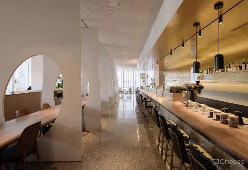 吧台区域首次设置了用餐位,用来满足愈来愈多的一或二人食,有独处的空间,不受干扰。胡桃木桌面搭配条纹玻璃隔板,再加上精致的铜制小台灯,为吧台餐位营造出温馨的氛围。