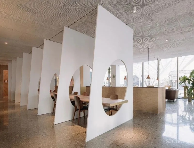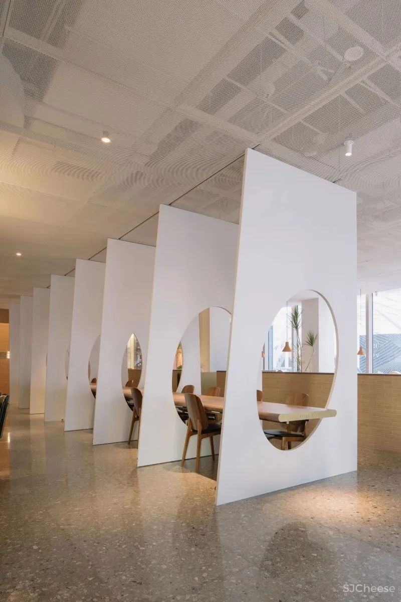 平日里,每块铝板与铝板之间,按4人位将餐桌隔开,确保用餐隐私。而其实铝板的顶部暗藏轨道,可以根据需要来移动铝板调整位置,用以满足2人位至16人位之间的自由切换。