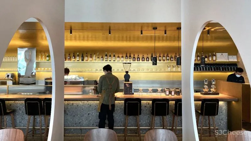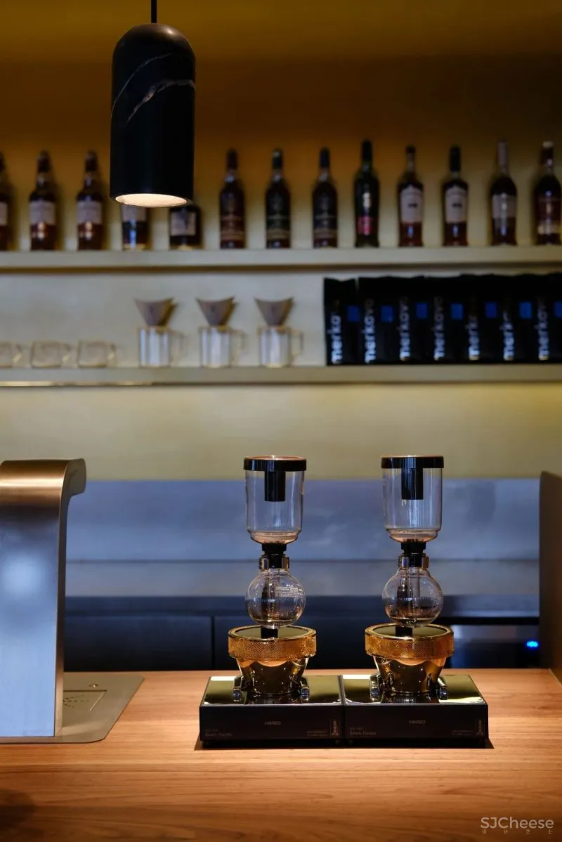 吧台另一侧开放区域提供各类饮品,虹吸壶、手冲、酒精、无酒精、特调,客人们可以坐在高吧凳上看着咖啡师/调酒师在面前沉浸式操作,也是蜜桃的一大特色。