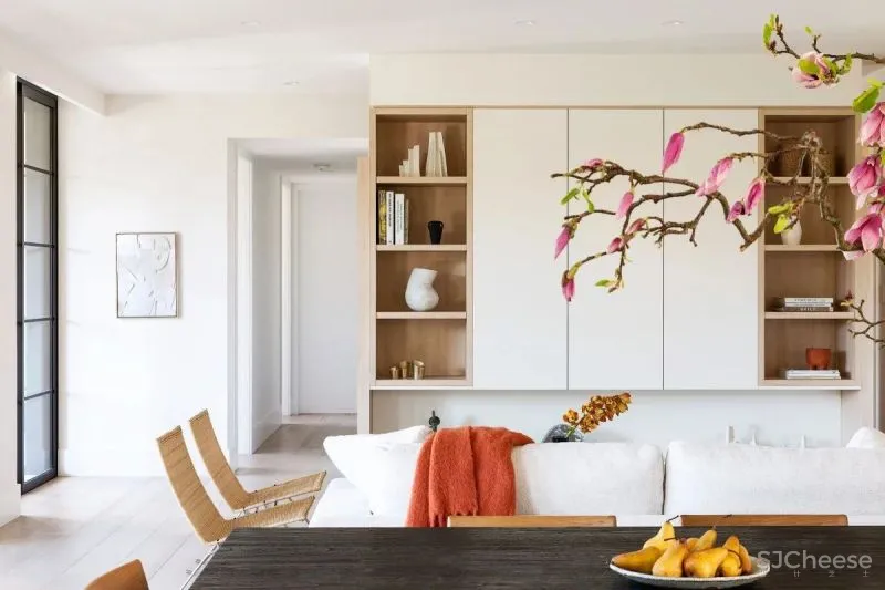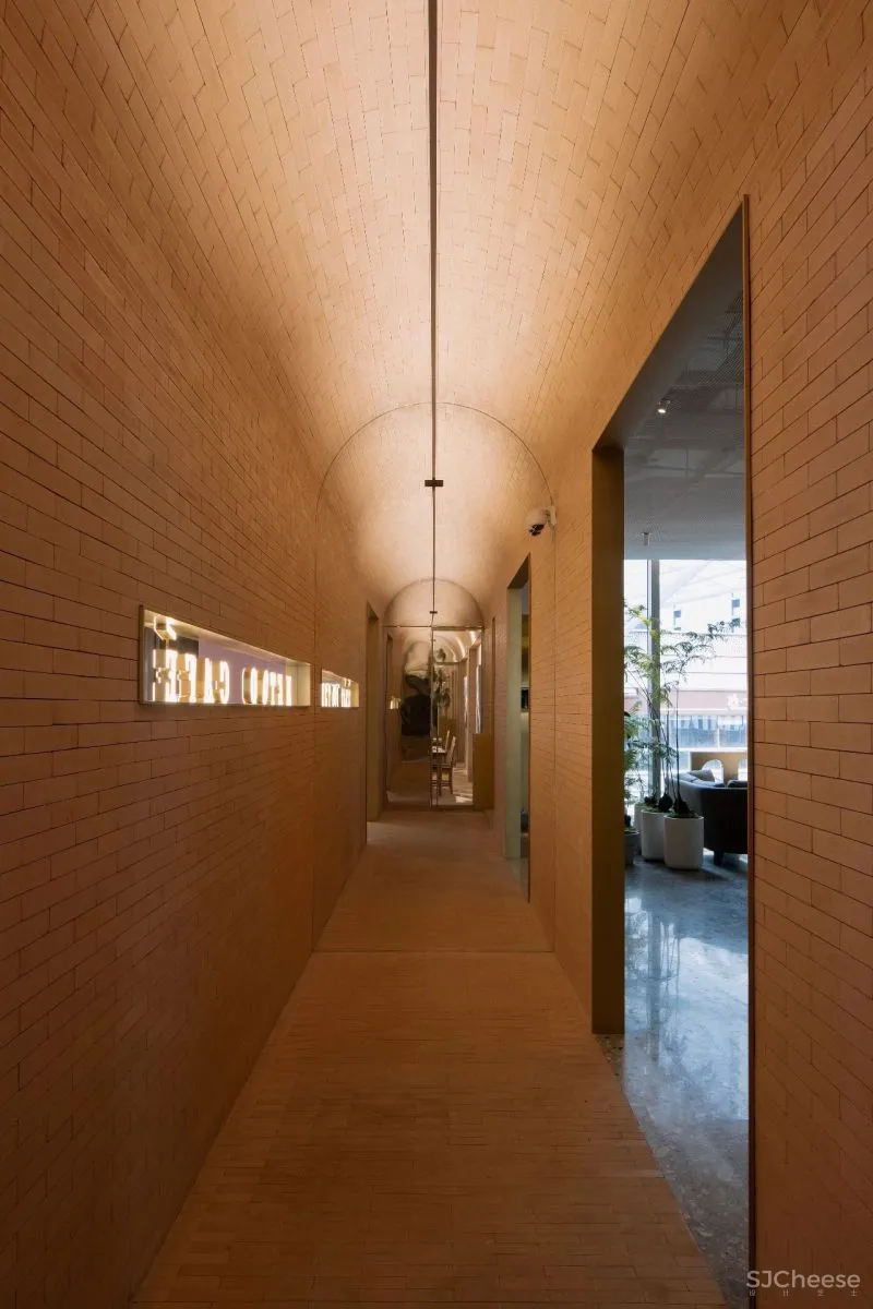 玄关左右两侧是长长的走廊,米色耐火砖由地至墙,连接拱形的圆顶,仿佛进入一座酒窖,玄关尽头的镜面又将通道与圆拱无限延伸。最初的规划里,业主计划该区域为红酒陈列区,可行进到一半策略调整,索性将这条通道留白设计。一侧可以通过玻璃窗望见餐厅内景,另一侧则跨界服装店铺的橱窗展示概念,将蜜桃的餐桌软装挂画一一搭配,成为用餐的情景展示区,每一位路过的客人都会想象自己成为画中人的场景。