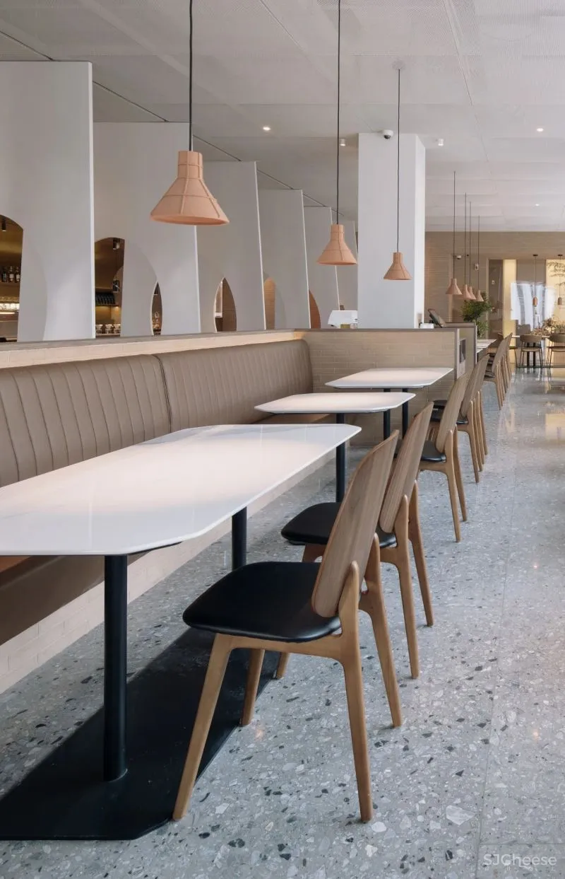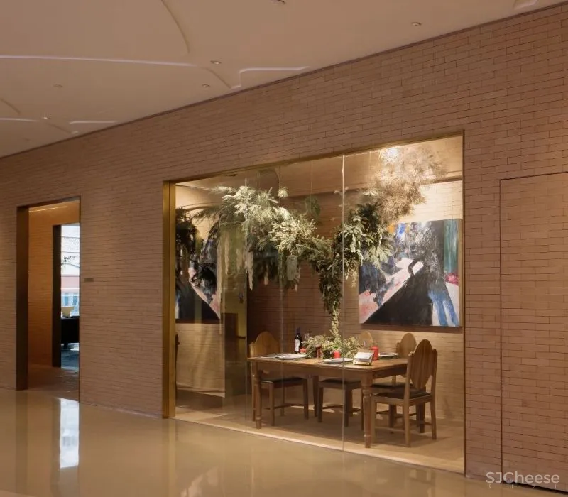 蜜桃餐厅向来追求放松舒适的就餐氛围,适合朋友与家庭的聚餐,也兼顾商务。针对商场熙熙攘攘的人流,餐厅希望尽可能提供舒适的用餐体验,外立面设计上采取了相对封闭的做法,用耐火砖将大部分的立面做了包裹,既增加用餐的私密性,也营造餐厅的高级感,减少外界干扰。
