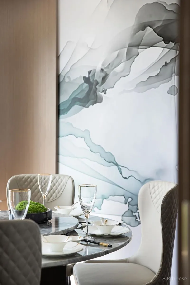 首先映入眼帘的清新古雅的山水背景画,搭配饱和度低的原木色,禅意淡雅的氛围感然而生,餐桌的大理石台面与山水画相得映彰,配上舒适的餐椅,精致的餐具,尽享饕餮盛宴。