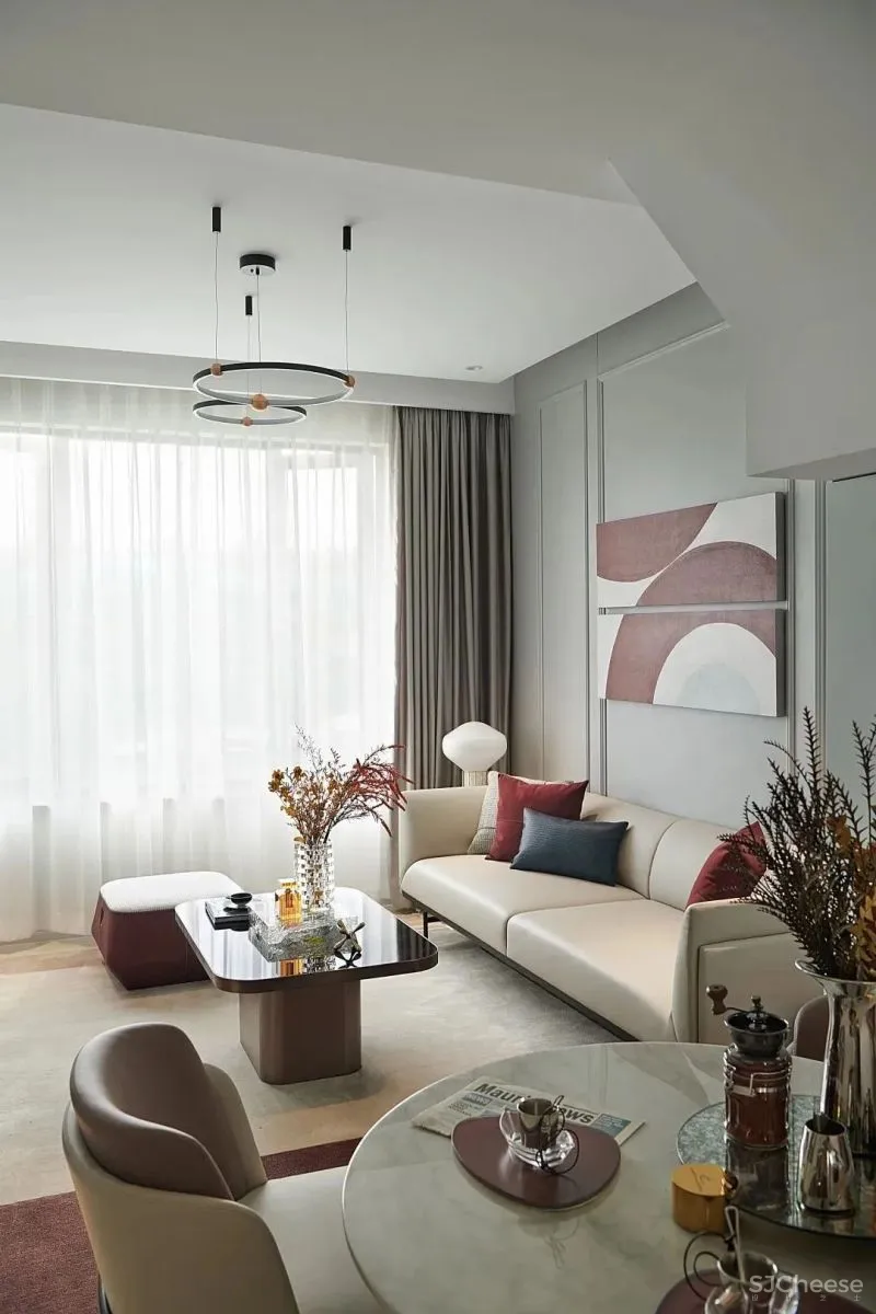 半透明的光在纱窗上意象铺叙,赋予美以戏剧性,在自然光影的映照下,灰咖色以装饰画与皮质家具为媒介显出沉稳高贵,极具设计感的灯饰、雕塑则将空间的情调氛围推向更浓郁的表达中,理性的空间中不乏精致细节。