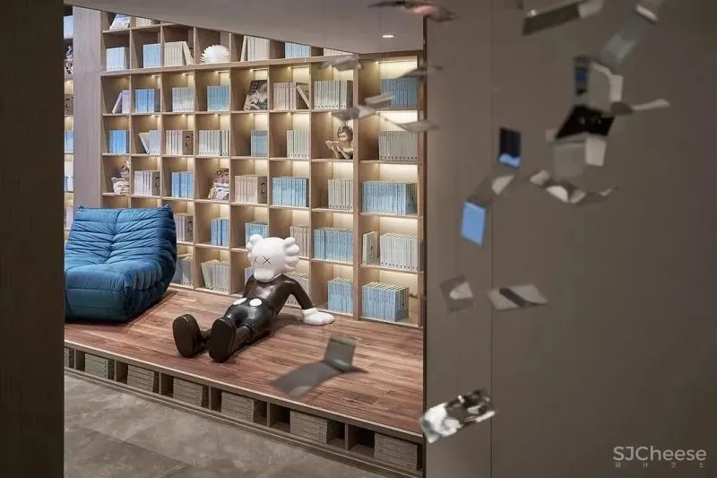 艺术、潮玩,是有着国际视野的“新克勒”生活中必不可少的精神世界。书房的陈列展示出现代艺术与东方哲学的融合;地下一层拥有整面挑高书架的儿童图书馆里,起源于颠覆式街头涂鸦的kaws主题形象融入其中,为亲子互动创造场景。