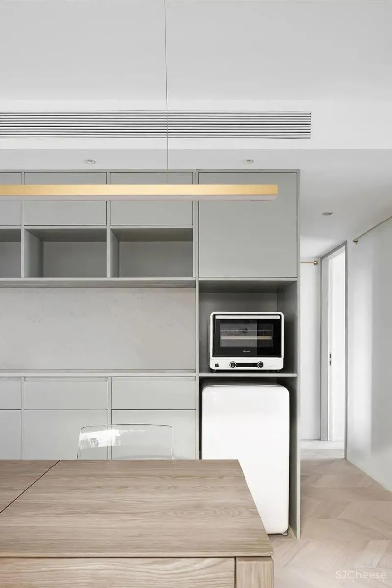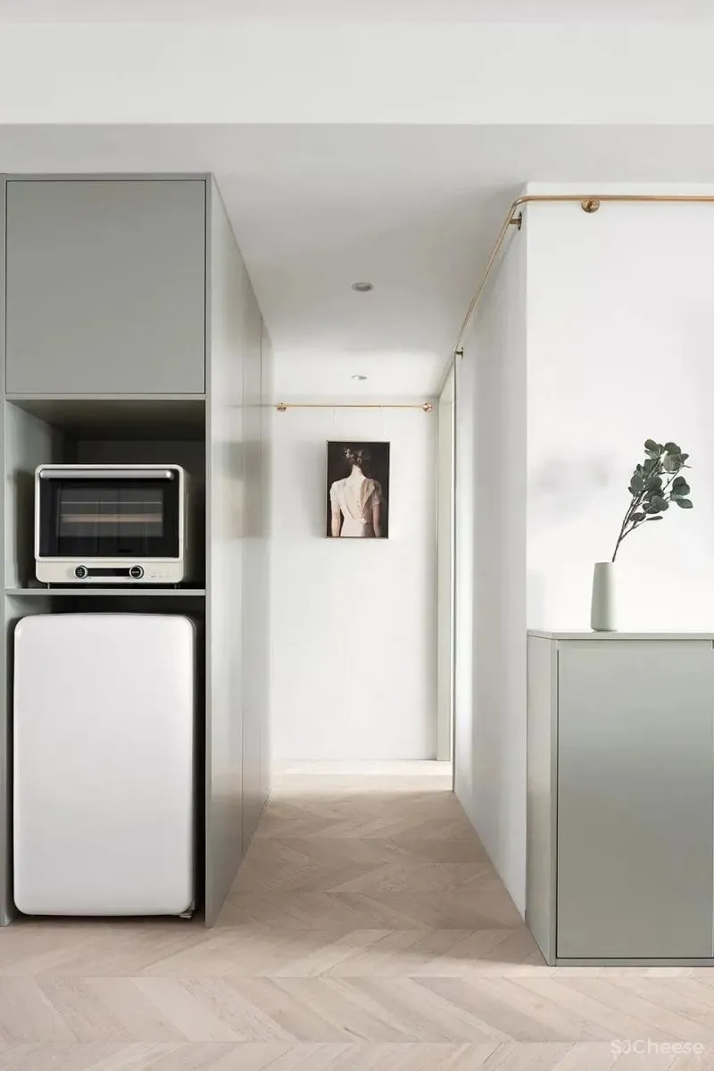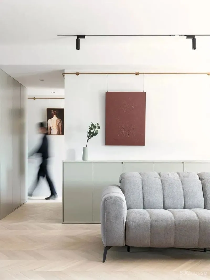 挂画杆沿着沙发背后的墙面转入过道,顺着墙面一直延伸到最内侧房间。打破了过道单调乏味的体验。整个过道区域也成为家庭画廊的一部分。过道区域同时也是全屋的家务区。在画廊的对面,隐藏在通高柜门的后方。
