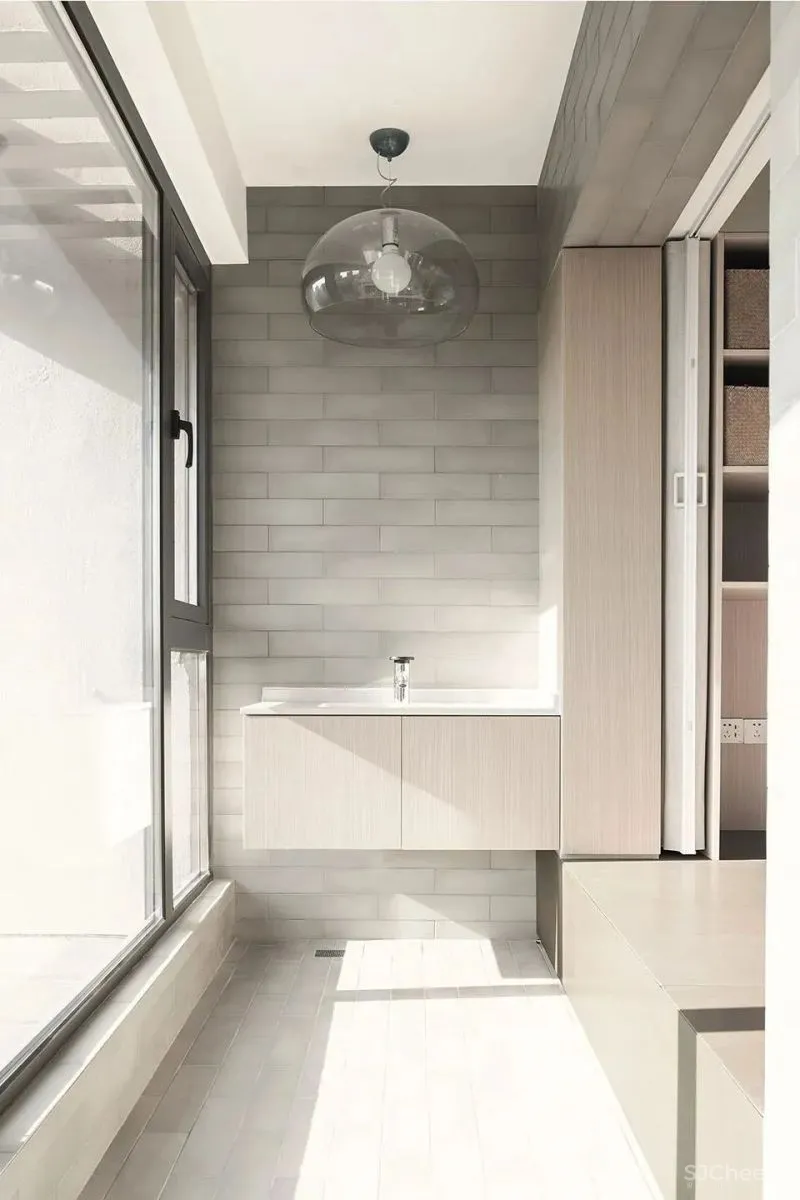书架装置将观影厅划分成两个区域。靠近阳台并且采光较好的一侧平时可作为运动区域使用。运动区与阳台直接相连,可通过百叶分隔。阳台用青色瓷砖作为墙地面材料,结合大面落地玻璃窗以及地台,营造出一种“坐在屋檐下”的半室外氛围。