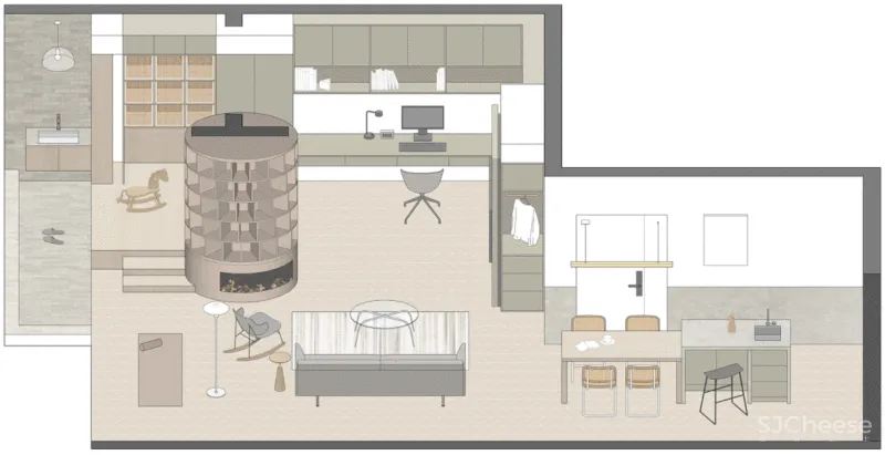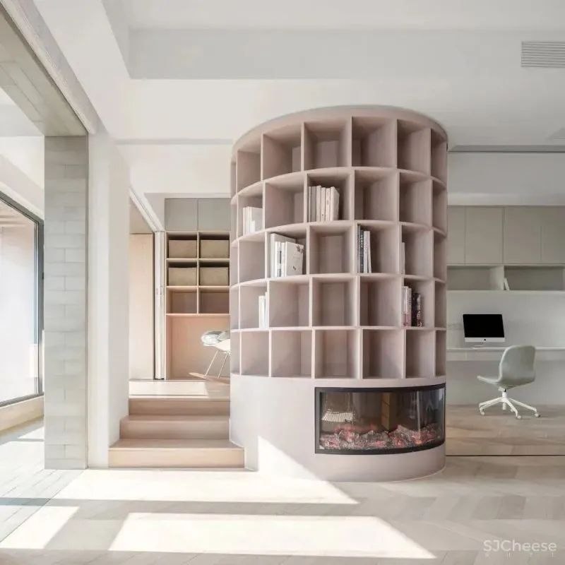 我们可以沿着圆柱形书架在不同场景之间穿梭。书架弧形的边缘模糊了各个区域的界限。我们在书架周围移动会看到连续变化的场景。这个装置为家庭公共区域提供了丰富的体验。错动的层板形态增强了其自身的动势。我们将其比作一个旋转中的涡轮,驱动着整个住家的丰富生活。在家庭公共空间内,阳台、地台、书房、观影区、运动区、家庭画廊、餐吧等功能区域围绕书架布置。