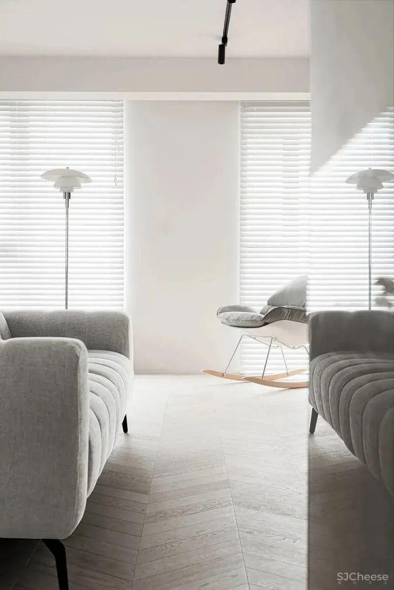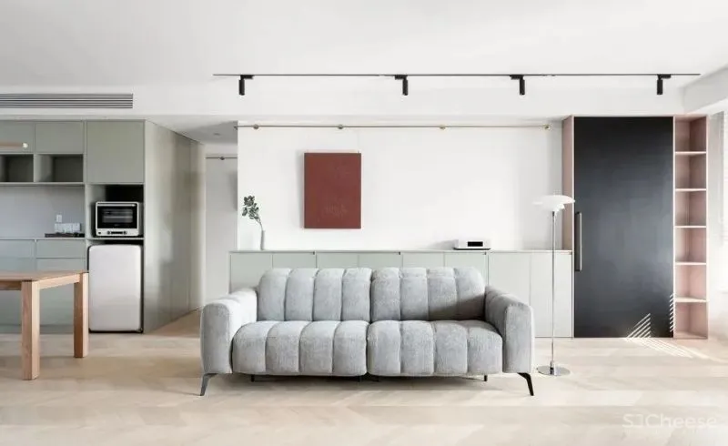 沙发后方的矮柜上方可做艺术品陈列。矮柜上方墙面留白。在墙面顶部设置一根挂画杆搭配钢丝挂钩可以灵活更换画品以及调整位置。陈列品、画品可以自由组合出各种形态。挂画杆、矮柜以及轨道式射灯的组合极大的提升了家庭画廊的灵活性与可能性。