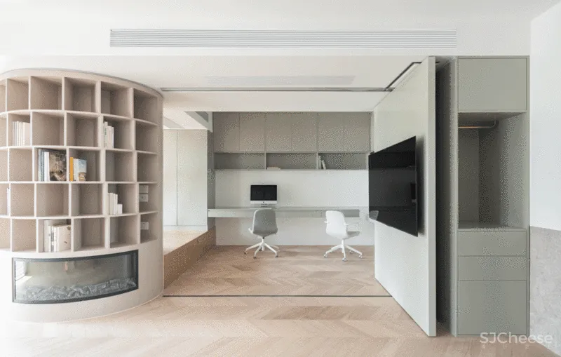 在观影区与书房之间设置了一组移门。我们可以通过调整移门的位置控制两个空间的开合度。移门可以在旋转90°后靠在一侧墙面。这样能够实现两个空间完全的封闭或联通。同时移门也能调整电视的观看角度,以满足公共空间使用的灵活性。